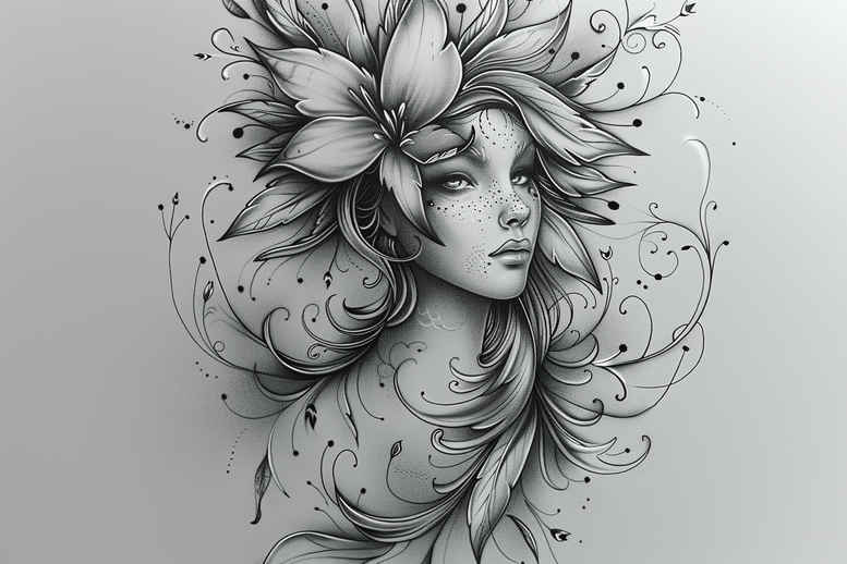 An AI-generated tattoo project concept presenting a refined black and grey fine-line portrait intertwined with botanical motifs. The central element is a serene woman’s profile, rendered with delicate linework that defines contour and expression without solid fills. Flowing hair dissolves into a field of lotus blossoms and petals, interwoven with wispy swirls and dot work to suggest movement and breath. The composition merges a portrait with floral design, a popular direction in contemporary fine-line tattoo collections, suitable for small to medium placements. The lotus symbol embodies purity, resilience, and growth, while the surrounding florals evoke renewal and beauty. The rendering emphasizes precision and restraint, using razor-thin lines to describe hair strands, petals, and skin contours, with subtle shading to create depth. Patterning emerges through curved vines, leaf motifs, and delicate stippling, providing a decorative frame that can blend with existing body art or stand alone as a sophisticated tattoo design. As an AI-generated tattoo project concept, it showcases how digital design translates into tattoo-ready art, preserving clean lines and scalable proportions for a custom tattoo design workflow. The imagery invites reinterpretation across scales and placements, from a discreet forearm piece to a more expansive back or shoulder composition, while maintaining balance, elegance, and botanical symbolism. The narrative embedded in the motif leans on themes of mindfulness and metamorphosis, appealing to seekers of meaningful tattoos, fine line tattoo enthusiasts, and lovers of floral tattoos alike. Keywords such as tattoo, tattoo design, meaningful tattoos, fine line tattoo, lotus flower tattoo, infinity tattoo, tribal tattoo, rose tattoo design, small tattoos, flower tattoos, custom tattoo design, Japanese style tattoo, black and grey, realistic tattoo, body art, ink are woven into the texture of the description to support discoverability and reflect current trends in the industry. This concept stands as a versatile blueprint for artists exploring botanical portraiture within a refined, monochrome palette.