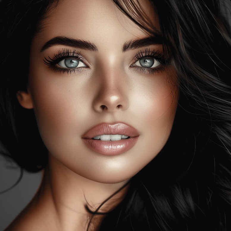Within studio lighting, this portrait presents a refined tattoo design concept intended for cover-up reference and inspiration for tattoo enthusiasts. The composition centers on the model’s face framed by dark, glossy hair, with a strong, luminous gaze that could be translated into inked linework or shaded fields. The eyes, rendered with a cool blue-green brightness, offer a focal point that can anchor a micro-realistic motif such as a lotus flower tattoo or a delicate rose tattoo design, using fine-line techniques and subtle stippling. The lips are softly glossy, providing a natural counterbalance to the architectural lines that could be echoed in a geometric pattern around the jawline. The skin holds a warm, natural gradient with careful soft shading to mimic skin tone under tattoo ink, enabling a tattoo artist to plan black and grey or colorwork that respects anatomy and light. This image reads as a portrait study but also functions as a versatile concept for tattoo translation: a small, refined piece to adorn the temple, behind the ear, or the nape, or a larger Japanese-style or tribal motif that weaves floral elements with negative space. For those seeking meaningful tattoos, the concept supports a range of directions—from a subtle fine-line tattoo to more elaborate full-sleeve narratives that harmonize with facial features. If extended into a larger composition, the piece can accommodate infinity symbols or geometric frames around the eye, while preserving realism in shading and texture. Because this is an AI-generated tattoo project concept, it invites designers to explore how portrait photography can inform an ink-ready design, bridging body art, studio lighting, and illustrative linework. The description emphasizes key elements—line weight, shading, negative space, and floral symbolism—while hinting at potential variations in color scheme, from black and grey to selective color that preserves the portrait’s mood. The result is a flexible blueprint for tattoo design exploration that remains faithful to the model’s expression and anatomy, yet clearly adaptable to cover-up scenarios where prior ink or scars require careful masking.