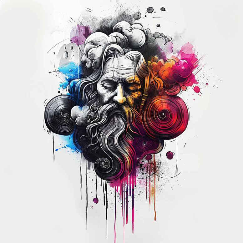 An AI-generated tattoo design concept that blends a realistic bearded portrait with a vibrant watercolor splash. The central motif is a bearded face rendered in grayscale, its features anchored by the beard and textured hair. A bold palette of blue, purple, pink, and orange washes radiates outward, bleeding into the skin with soft edges and deliberate drips to suggest movement and life. Black ink accents sharpen the eyes, nose, and mouth, ensuring readability even as color bleeds frame the composition. Behind the figure, circular motifs add depth without competing with the portrait, a nod to modern graphic trends while preserving readability for placement on larger surfaces. Symbolically, the portrait can signify wisdom, resilience, and transformation, with color implying energy and renewal. The design is well-suited for a larger area such as the back, chest, or shoulder, and can function as a strong cover-up base due to its dark core and high-contrast edges around the splash. Technically, the piece blends fine line tattoo sensibilities with watercolor technique, offering a versatile platform for customization—whether integrated with lotus flower tattoo, infinity tattoo, or tribal / Japanese style elements, or adapted toward floral motifs. For tattoo enthusiasts seeking meaningful tattoos, this concept delivers a bold yet refined statement: a timeless portrait brought to life with vivid color, ink texture, and modern composition. As an AI-generated tattoo project, it illustrates how digital concepts translate into wearable body art, while remaining adaptable to scale, placement, and personal symbolism for small tattoos or large, impactful pieces; it also hints at potential explorations in black and grey realism.