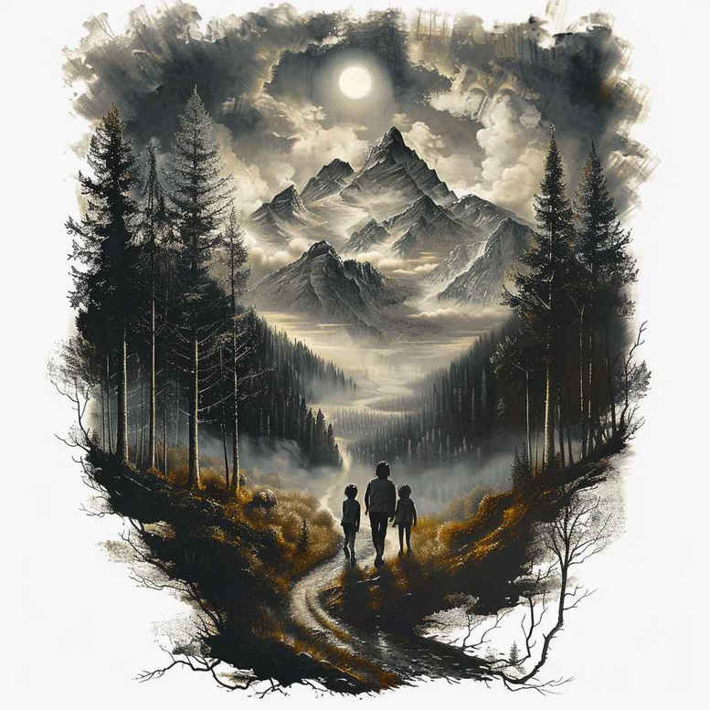 This AI-generated tattoo concept presents a moody grayscale landscape designed as a cover-up ready project. The central composition features a jagged mountain range framed by tall pines, with a narrow winding path that leads to two silhouetted figures beneath a moonlit sky. Soft mist diffuses the light, producing a gradient from deep black to pale ash that translates well into skin. The piece leans toward realism rather than bold linework, balancing negative space with light stippling and fine-line detailing to capture rock texture, bark, and drifting clouds. The figures provide scale and narrative—an invitation to reflect on journeys, companionship, and personal growth—an ideal motif for meaningful tattoos. Symbolically, mountains convey endurance, the forest suggests mystery and renewal, and the moonlight embodies guidance through darkness; these themes harmonize with popular ink concepts like infinity tattoo and rose tattoo design, while remaining adaptable to lotus flower tattoo or tribal tattoo motifs if desired. For a Japanese style tattoo approach, the design can be adapted with restrained sumi-e shading and crisp contour work to preserve the grayscale tone while adding a touch of Asian aesthetic. Technically, the concept relies on layered black ink, smooth gradient washes, and precise edge control to ensure longevity and legibility on skin, whether realized as a small tattoo or expanded into a larger sleeve. This is a genuine tattoo design concept that blends landscape realism with personal storytelling, and as an AI-generated tattoo project, it serves as a strong client-presentable base. Given its dark tonal range, the concept is particularly well-suited for cover-ups, offering a cohesive path to conceal older work while preserving narrative imagery. The final tattoo could evolve with placement, skin tone, and aging considerations, staying faithful to black and grey execution while inviting future growth in body art.
