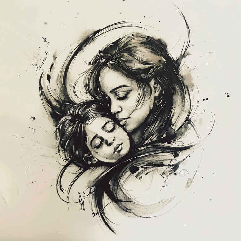 This AI-generated tattoo project presents a finely executed black-and-grey linework study capturing a mother and child in a tender embrace. The composition relies on delicate, flowing strokes that define silhouettes with minimal shading, allowing negative space to suggest facial features and contours of the figures. The mother figure curves protectively around the child, whose small head rests beside hers, creating a moment of intimate connection that translates well to a tattoo design intended for the upper arm, chest, or back. The emphasis on linework over dense fill makes the piece readable at small scales, while the dark ink provides strong contrast that remains legible over time. The interplay of line weight—thicker outlines at the outer edges and finer lines within the faces and hair—gives a sense of depth and motion, echoing traditional European sketch techniques and contemporary fine line tattoo aesthetics. In terms of technique, the artist employs controlled hatching and soft gradient shading to suggest form without muddying the image; the result is a crisp, timeless portrait-style design in black and grey. The symbolism centers on maternal love, protection, and the bond between generations, making it a meaningful tattoo choice for someone seeking a commemorative piece or a tribute to family. Key elements visible in the design include the mother, the child, flowing hair, and exposed neck and shoulder areas, which can be adapted in placement and size to suit individual bodies. From a commercial perspective, this concept reads as a versatile cover-up solution: the dense areas of black linework can be leveraged to mask existing darker tattoos, while the white-space corridors preserve clarity and longevity. While clearly AI-generated, the concept demonstrates strong potential for a custom tattoo design that can be refined by a tattoo artist into a finished piece. If a client desires further refinement, modifications can include enhancing the hair texture, adjusting line weight for larger canvases, or incorporating subtle background motifs in a Japanese style tattoo or floral accents, all while preserving the core emotional message. For viewers seeking a traditional or modern approach, the piece remains adaptable; however, the current render leans toward a modern, minimalist aesthetic suited for small-to-medium sized placements. Because of the strong black elements and restrained shading, this design is particularly well-suited as a cover-up concept for darker existing tattoos, offering a clear path to integration while preserving emotional significance.