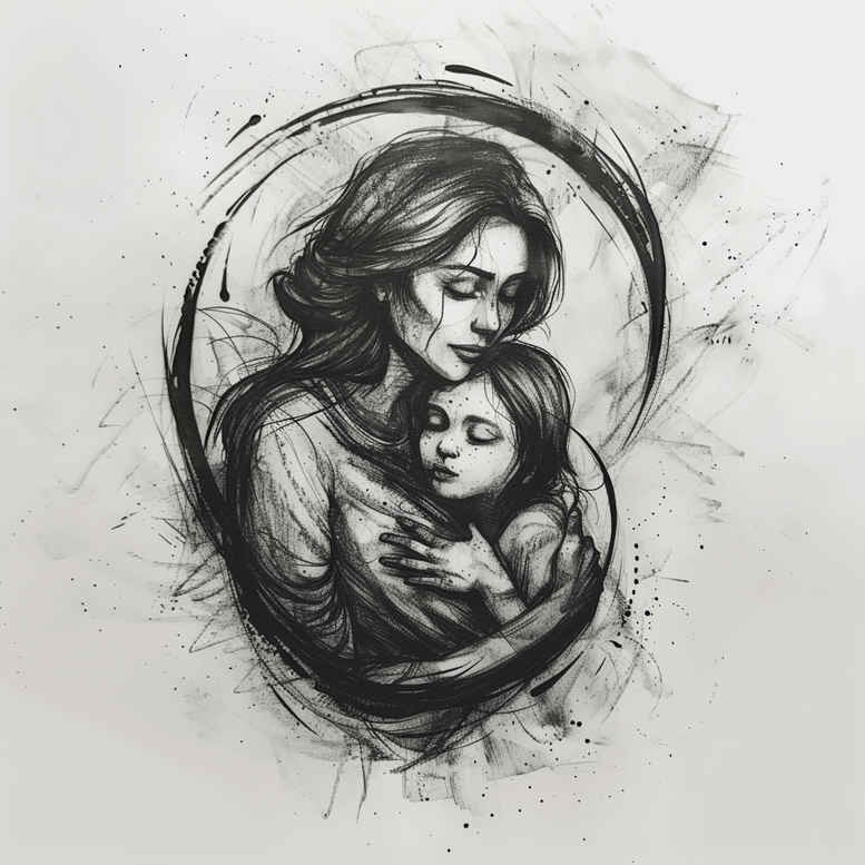 An AI-generated tattoo project concept in grayscale, this image features a mother cradling her child, framed by a circular halo and sketchy, flowing lines that read like a refined pencil study translated into ink. The design leans on fine line tattoo technique with controlled shading, producing a timeless portrait in black and grey that remains legible as a wearable piece. The central figures are rendered with tenderness and clarity, while the halo adds a symbolic circle of protection and continuity around the family moment. This tattoo design is ideal for meaningful tattoos that celebrate family, love, and memory, and it can be scaled for small placements or expanded into a larger back, chest, or sleeve composition. The piece works well as a cover-up concept, since the strong silhouette and negative space can mask existing work without sacrificing the emotional core. While rooted in realism, the linework retains a gentle softness that suits both minimal and more elaborate applications, allowing integration with Japanese style tattoo or subtle tribal motifs if desired. The grayscale palette ensures versatility across skin tones, and the design can accommodate additional elements such as a lotus flower tattoo or infinity tattoo motifs along the periphery if a client seeks extended symbolism. This AI-generated concept demonstrates how digital ideation informs traditional tattoo practice, offering a custom tattoo design that is timeless, adaptable, and ready for collaboration. Keywords include tattoo, tattoo design, meaningful tattoos, fine line tattoo, lotus flower tattoo, infinity tattoo, tribal tattoo, rose tattoo design, small tattoos, flower tattoos, custom tattoo design, Japanese style tattoo, black and grey, realistic tattoo, body art, ink.