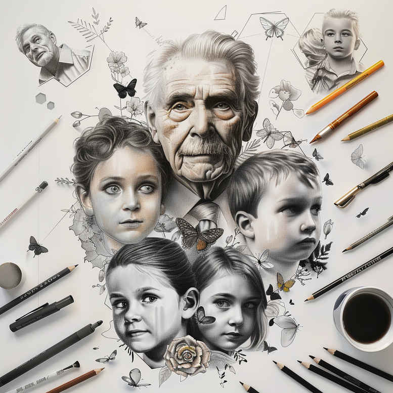 An AI-generated tattoo project concept presented as a grayscale portrait collage. The composition centers on an elderly man flanked by several children’s faces, all rendered in black and grey with meticulous shading. The arrangement reads like a family heritage tableau, a timeless meditation on memory, lineage, and guidance across generations. Visible in the background are sketch tools and pencil strokes that echo the art of drawing and frame the portraits, offering a natural transition into a sleeve or back-piece design. Technique-wise, the piece relies on fine line shading, smooth gradient work, and restrained cross-hatching to sculpt realistic facial features while preserving a cohesive grayscale balance. The central man’s expression anchors the piece with gravitas, while the surrounding faces convey curiosity and warmth, creating a narrative arc that invites personal interpretation. As a tattoo design concept, the work lends itself to adaptation: the portraits could be separated into panels for a vertical composition or expanded into a larger, continuous scene. The heavy emphasis on grayscale tonal values helps ensure longevity of the ink and readability over time, particularly on bodied-as canvas areas. It can be a strong cover-up option due to its dense tonal range and ability to mask underlying marks with layered shading, should that be desired. This concept is an AI-generated tattoo project, crafted to explore how a portrait collage can translate into durable body art with a modern sense of realism while maintaining meaningful tattoos about family, memory, and legacy. Keywords associated with the project include tattoo, tattoo design, meaningful tattoos, fine line tattoo, lotus flower tattoo, infinity tattoo, tribal tattoo, rose tattoo design, small tattoos, flower tattoos, custom tattoo design, Japanese style tattoo, black and grey, realistic tattoo, body art, and ink.