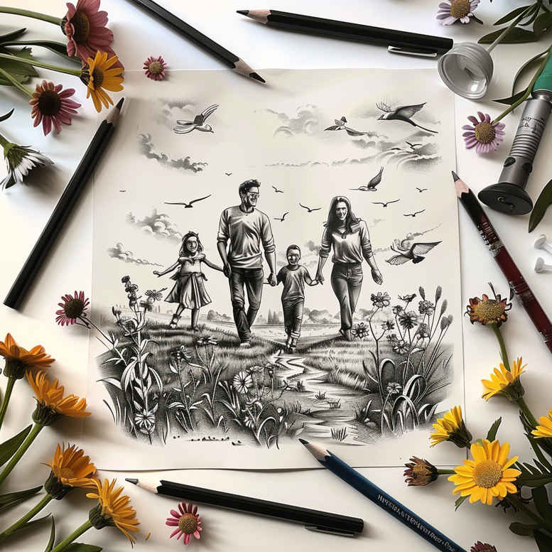 This concept presents a family-oriented scene rendered as a black and grey fine line tattoo design. The central motif is a family group walking hand in hand across a tranquil field, with a flock of birds overhead, captured in precise lines and restrained shading. Executed as a concept sketch, the image relies on delicate contours, negative space, and measured tonal variation to create a legible silhouette that remains crisp when scaled for a tattoo. The composition emphasizes unity, memory, and journey, inviting personal symbolism for clients who value meaning over bold graphic. The figures are simplified to clean outlines to honor timeless silhouettes, while the surrounding landscape is suggested through fine hatch work that evokes wind, grass, and distant horizon without overpowering the figures. The result is a versatile blueprint suitable for a large back piece or a discreet forearm study in black and grey, adaptable to various placements and sizes. In a real session, the design can be customized by adjusting the number of family members, adding dates, initials, or an infinity tattoo motif to represent enduring bonds; floral accents such as lotus flower tattoo elements or small blossoms can symbolize growth, resilience, and new beginnings. The AI-generated tattoo project concept serves as a solid foundation for a bespoke piece, where an artist can refine line weights, shading gradients, and scale to skin type and placement. The description weaves in tattoo design keywords for discoverability, including fine line tattoo, black and grey, meaningful tattoos, flower tattoos, and custom tattoo design, while maintaining a timeless, hand-drawn vibe that translates well to ink and body art. As a concept, it aligns with Japanese style influences in its restrained composition and focus on silhouette, offering a refined template for those seeking small tattoos or larger, narrative-driven work.