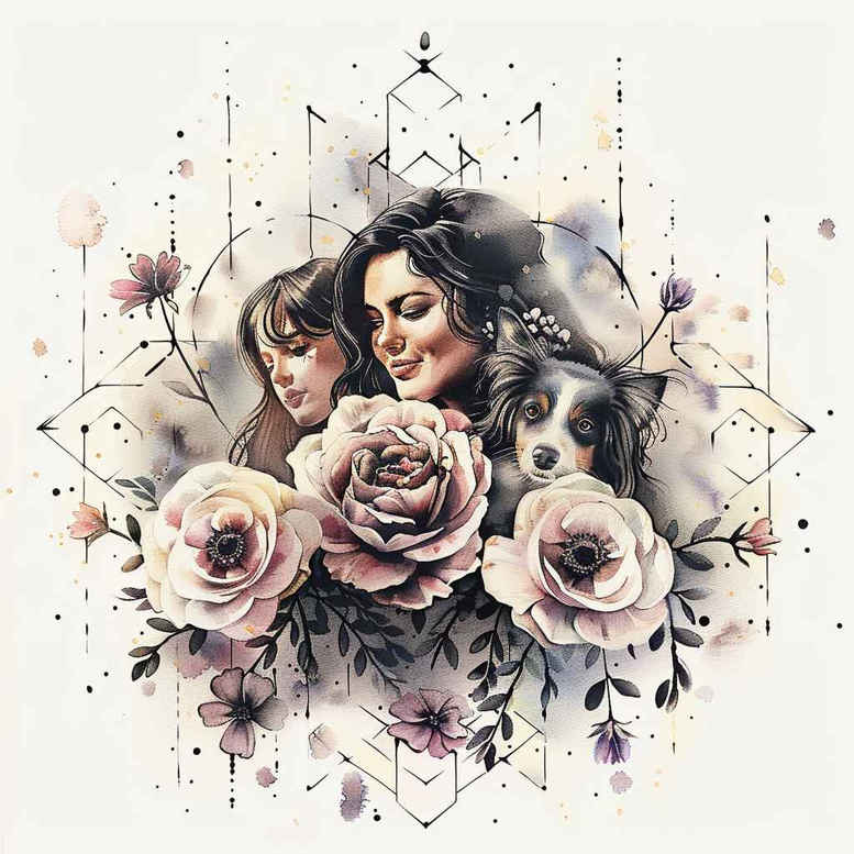 An AI-generated tattoo project concept that fuses a portrait of a calm woman with a cluster of roses and an intricate geometric framework. The central figure is depicted in refined linework with subtle shading to convey a calm expression and lifelike presence, while the roses provide a vivid burst of color and softness that anchors the composition. A geometric pattern of triangles, diamonds, and intersecting lines surrounds the figure, creating a contemporary counterpoint to the organic forms and giving the design a sense of movement and structure. The watercolor-like washes simulate a painterly texture, with pinks and mauves in the florals that fade into cooler gray tones in the skin and background, producing a harmonious balance between color and monochrome. Technically, the portrait and floral elements rely on fine line tattoo techniques to preserve clarity at small scales, while the blooms receive looser, more saturated color blending to evoke depth and light. This concept nods to Japanese and tribal influences through disciplined linework and rhythmic repetition, yet remains accessible as a universal tattoo design that can suit a variety of placements, from forearm to shoulder, and even serve as a meaningful start for a larger piece. The contrast between the black and grey shading of the portrait and the colorful florals enhances legibility when inked on skin, and the geometric motif offers strong negative space opportunities for future expansion. The image is a clear example of a modern tattoo design that merges classic motifs with contemporary aesthetics, suitable for small tattoos or a larger statement, and it embraces the possibility of customization to reflect personal symbolism. As an AI-generated tattoo project, this concept provides a template that can be adapted to individual stories, scale, and skin tone while showcasing how ink, line, and color interact to create cohesive body art. In summary, the design embodies meaning through floral symbolism and structural geometry, delivering a refined, timeless tattoo design that appeals to collectors of meaningful tattoos and those exploring custom tattoo design methods.