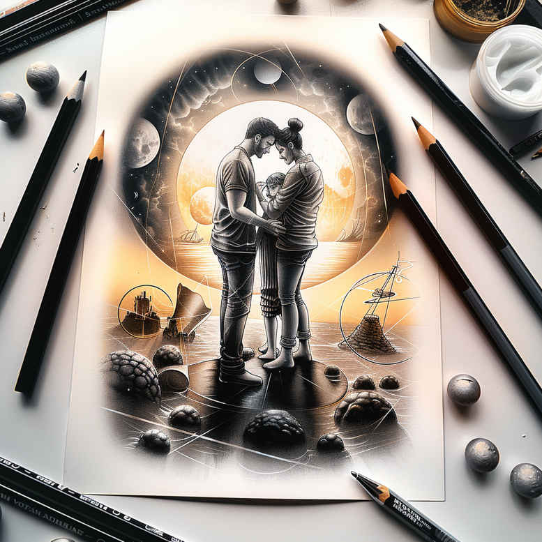 This AI-generated tattoo project concept presents a romantic couple rendered in silhouette, embracing within a circular frame that acts as a focal ring on a white drafting sheet. The central figures are defined by solid black ink with soft gray shading to create depth and separation from the circular border, while the surrounding space remains intentionally restrained to maintain legibility when miniaturized for small tattoos. The frame anchors the composition and suggests continuity, eternity, and unity, themes commonly explored in meaningful tattoos and love motifs. The surrounding studio props—a pencil, eraser, and cup—frame the artwork and underscore that this is a concept sketch ready to translate into a custom tattoo design. The piece deploys a realistic/illustrative approach in black and grey, with clean linework for the couple and crisp edges along the ring to preserve clarity on skin. Subtle gradient shading helps sculpt the figures, lending a sense of volume without overwhelming detail, making this design versatile for various placements from wrist to shoulder. Symbolically, the circle can symbolize wholeness and commitment, while the couple’s embrace communicates enduring partnership and mutual support—messages that resonate with many small tattoo designs for meaningful tattoos, particularly in black and grey ink. As a concept derived from AI-generated ideas, it demonstrates how a simple silhouette inside a circular motif can carry emotional weight while remaining adaptable for personalization such as adding floral accents, infinity symbols, or lotus motifs if desired. The composition is suitable for scaling and adaptation in a traditional or modern style tattoo, with potential for translation into Japanese inspired or realistic tattoo aesthetics depending on the client’s preferences. Artists can refine line weight, adjust circle radius, and integrate negative space to maximize contrast on black and grey skin. The concept also explores variations such as exchanging the circular ring for a more geometric mandala, or integrating small text hints along the curve for a personalized touch.
