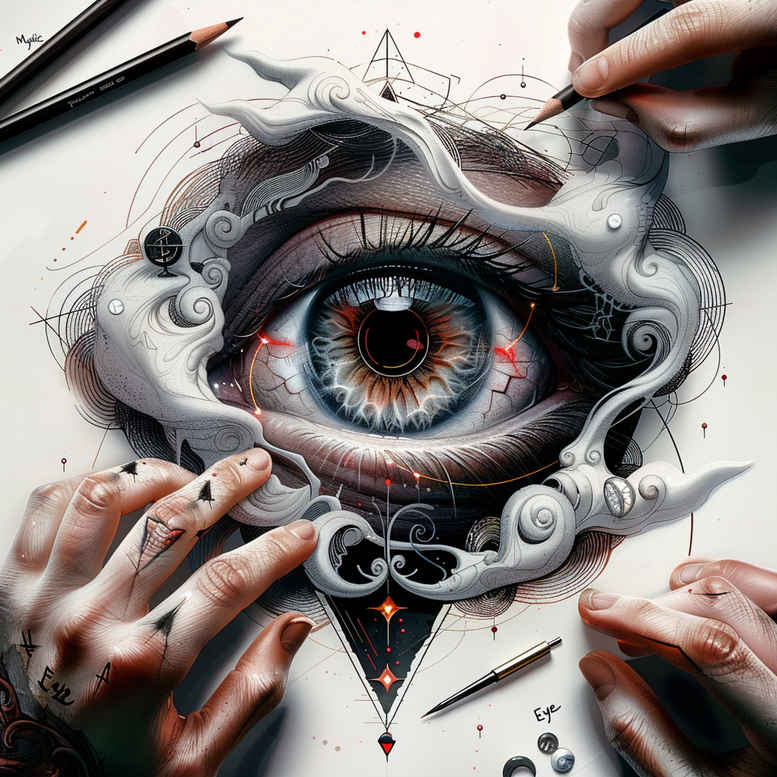 This AI-generated tattoo project presents a close-up composition centered on a vividly rendered eye, surrounded by an intricate frame of scrollwork and geometric accents. The central motif: the eye is rendered with fine line precision, the iris colored with warm brown tones and the sclera rendered in smooth grayscale to emphasize depth and realism. Two hands emerge from the edges, guiding the gaze toward the eye, while the ornate frame and filigree create a sense of movement and containment. A pencil and a small pendant are visible as part of the planning-era vibe, suggesting this concept is a design study rather than a finished piece. The piece sits firmly in the black and grey spectrum, though selective shading adds minute warmth to key details, reinforcing the sense of a three-dimensional eye within a ceremonial surround. The overall effect is that of a tattoo design with a high degree of linework fidelity, making it suitable as a fine line tattoo study. The pattern-heavy ornamentation communicates a sense of mystery and meticulous craftsmanship, with the frame acting as a boundary that keeps the gaze anchored while leaving negative space to breathe. The symbolism centers on perception and protection—the eye as a sentinel, the hands as support, and the frame as a shield around the gaze. In the context of tattoo history, this concept nods to Japanese style tattoo aesthetics through its disciplined linework and grayscale shading, though it remains accessible as a modern black and grey study suitable for small tattoos or larger body art. Readers will appreciate the clear visibility of the elements, the balance between negative space and intricate pattern, and the potential for customization in a client brief. For those seeking meaningful tattoos, this design demonstrates how an eye motif can serve as a personal emblem, while the ornamental pattern elevates it to a statement piece. As an AI-generated tattoo project, it highlights how digital ideation can translate into body art, with emphasis on a clean composition, consistent line weight, and scalable design ready for tattoo artists to adapt in Japanese-inspired or contemporary settings.