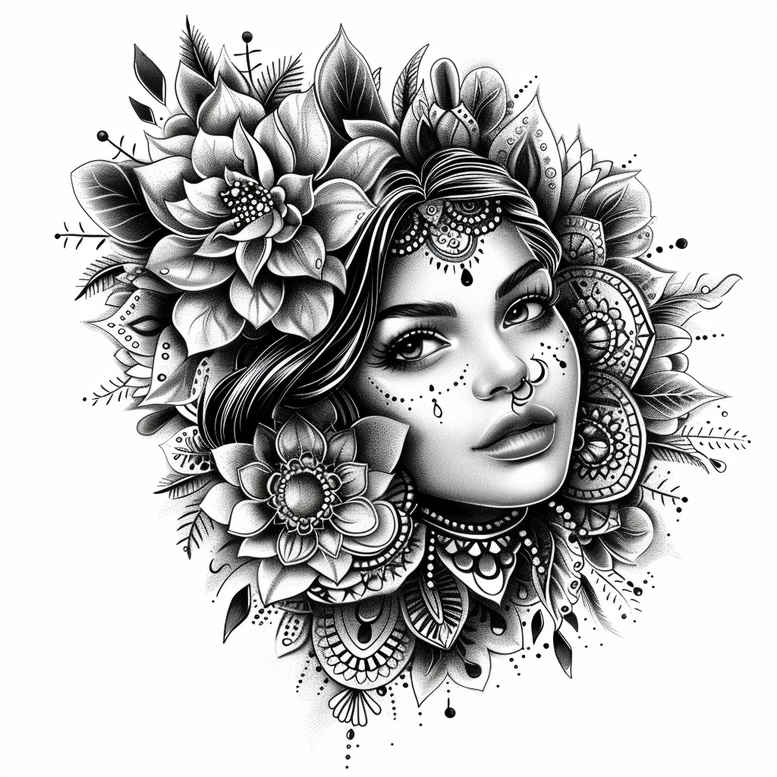 An AI-generated tattoo project concept presenting a finely rendered portrait of a woman’s face framed by an intricate bouquet of flowers. The linework is crisp and dense, with careful shading in black and grey that creates depth without eliminating the negative space essential to a wearable piece. The composition centers on the woman’s calm gaze, her hair weaving through blossoms that radiate outward in a mandala-like halo, a motif that blends natural realism with decorative patterning. The visible elements include the woman’s face and upper shoulders, surrounded by blossoms, petals, and subtle foliage. The design relies on a balance of fine lines and stippling to achieve texture—skin tone is subtly suggested, while the flowers carry bold, graphic outlines. This tattoo design is adaptable to various placements, from forearm to back, and the pattern-like rhythm of the petals makes it ideal for a larger sleeve or chest panel as a secondary feature. Given its high contrast and dense linework, the concept serves as an excellent cover-up option, capable of masking older ink while introducing a focused portrait focal point. The symbolism of blossoms around a face often conveys renewal, beauty, and resilience, echoing personal narratives of growth and transformation. As an AI-generated tattoo project concept, it demonstrates how modern tattoo art can fuse realism with ornamental flower motifs, offering meaningful tattoos for those seeking a decorative yet expressive piece. The style bridges fine line precision with a timeless black-and-grey palette, aligning with real-world tattoo workflows and custom tattoo design processes. This concept supports a range of outcomes, including small flower tattoos or large-scale body art, and remains compatible with Japanese-inspired attention to line integrity while preserving a contemporary aesthetic and readability of the ink.