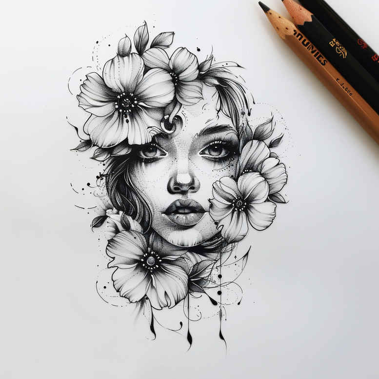 AI-generated tattoo project concept presented as a refined black-and-grey floral portrait. The image features a central female head rendered in meticulous line work, framed by a crown of blossoms that sways around the temples and neck, with petals spilling into delicate droplets that dissolve into negative space. Executed in a pencil sketch aesthetic, the design relies on a nuanced balance of soft shading and crisp outlines to simulate a tattoo-ready transfer while preserving an artful sense of light. The visible elements are the face, the floral crown, and the trailing petal tendrils, all captured in black and grey, inviting a tattoo artist to translate the concept with precision or to adapt it into a small- to medium-sized piece. The composition integrates botanical rhythm with portraiture, echoing influences from fine-line tattoo practice and Japanese-inspired ornamentation, while maintaining a modern, monochrome sensibility suited for black and grey ink. The symbolism is deliberate: flowers crown the head as a motif of growth, renewal, and resilience; the calm, introspective gaze of the subject suggests inner strength and contemplation—an ideal pairing for meaningful tattoos that fuse natural beauty with personal narrative. For clients seeking versatility, the roots of this concept can be expanded into a lotus flower tattoo motif or additional flora, or pared back for a minimalist small tattoo. The piece also works as a strong cover-up concept where careful shading and detailed line work can mask prior markings while preserving the new design’s elegance. This is a prime example of an AI-generated tattoo project concept, intended to inspire studios and collectors alike and to demonstrate how a refined portrait-flower fusion can translate into timeless body art that reads well in both traditional and contemporary settings, with potential for expansion into infinity- or tribal-inspired motifs if desired.