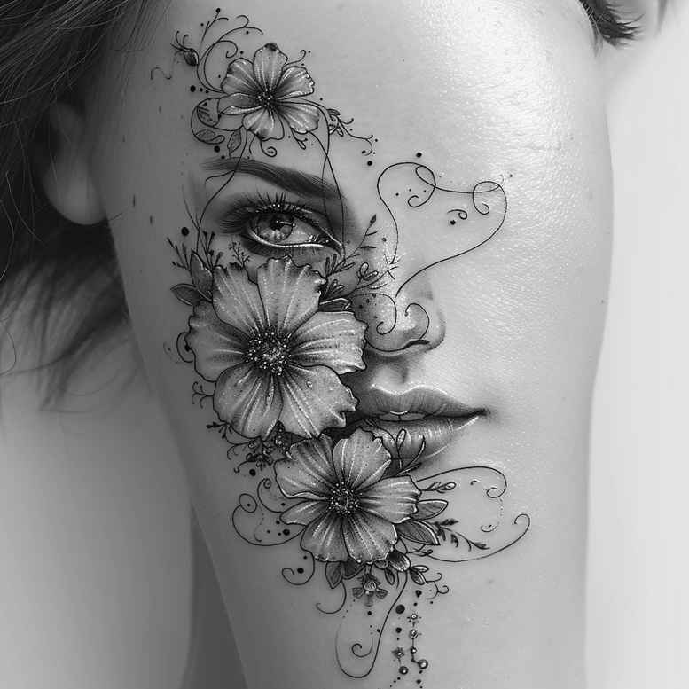 AI-generated tattoo project concept presented as a refined fine-line portrait with botanical accents. The composition centers on a graceful female profile rendered in black and grey, with soft gradients defining the contour of the cheek and the line of the jaw, while a spray of flowers weaves around the temple and lower face. The petals and stems are executed in delicate lines, supported by subtle dot shading and whisper-thin cross-hatching to create depth without heavy block shading. The floral elements read almost as lace: daisies or daisies-like blossoms circle the eye area and cascade along the jaw, their positive and negative space carefully balanced to keep the portrait legible on skin. Decorative swirls and small bead-like motifs extend from the flowers, producing a rhythm that unifies the natural motif with ornamental detail. The overall design favors negative space to preserve clarity for future modifications, making it a practical option for a cover-up if needed, while still standing alone as a meaningful tattoo design. The symbolism of flowers paired with a human face invites interpretation: flowers often signify growth, renewal, and memory, while the portrait anchors personal identity and emotion, yielding a composition rich in narrative potential. Technically, the piece leverages black and grey ink with varied line weights to achieve texture and dimension, a hallmark of fine line tattoo artistry. The concept is adaptable: it can scale from a compact forearm piece with a handful of blossoms to a larger shoulder or upper arm work where the floral strands unfurl with greater detail. It nods to Japanese-style tattoo precision through clean, continuous line work and a restrained aesthetic, while remaining accessible in a modern, realistic tattoo idiom. As an AI-generated tattoo project concept, it demonstrates how portrait and floral motifs can coexist elegantly, offering customization options such as flower type, scale, and likeness to suit individual meaning, skin tone, and placement. In short, this design embodies a timeless black and grey flower tattoo design with fine-line refinement, suitable for those seeking meaningful tattoos, small tattoos, or a bespoke tattoo design that balances portraiture and botanical beauty, with strong potential for cover-up or enhancement in a dedicated tattoo session.