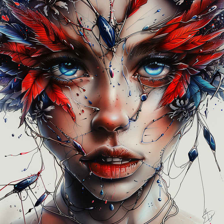 AI-generated tattoo project concept presented here explores a cover-up friendly portrait rendered with a dynamic red and blue splatter motif. The focal point is a female visage, captured in close-up, with piercing blue eyes and a composed expression that anchors the viewer. Fine line tattoo elements trace subtle contours of the face, while a chaotic glaze of red and cobalt splatter erupts around the cheeks and temples, suggesting movement, energy, and transformation. The design embraces both realism and abstraction, balancing precise shading with liberated ink to form a compelling, versatile tattoo design. The interplay of negative space and bold splashes invites careful placement, making it an excellent candidate for covering existing imagery while incorporating meaningful tattoos like a lotus flower tattoo or rose tattoo design in future stages. The concept nods to Japanese style tattoo influences through sweeping lines and a restrained black-and-grey backbone, yet the color palette remains vibrant, integrating black for line work and crisp color washes for drama. For a client seeking small tattoos or larger body art, this piece offers scalable options: from a fine line accent to an expansive sleeve, while preserving legibility on the skin’s surface. The use of color splatter across a white backdrop emphasizes the facial features and can be adjusted to suit darker skin tones by deepening the ink density or shifting purple-blue tones into warmer reds. In terms of technique, the artwork proposes a blend of digital planning and traditional stencil work, with clear emphasis on skin texture, pore realism, and subtle highlights that mimic light catching the lips and cheekbone. As an AI-generated tattoo project concept, it aims to provide inspiration for artists and clients exploring bold, graphic departures from conventional portraits; it also gestures toward themes of renewal, resilience, and personal evolution often sought in meaningful tattoos, including infinity tattoo motifs. In the final execution, the piece can be refined into a full-color, Japanese-inspired or modern tribal-inspired tattoo design, or transformed into a black and grey study for a more subdued aesthetic, offering diverse options for a custom tattoo design.