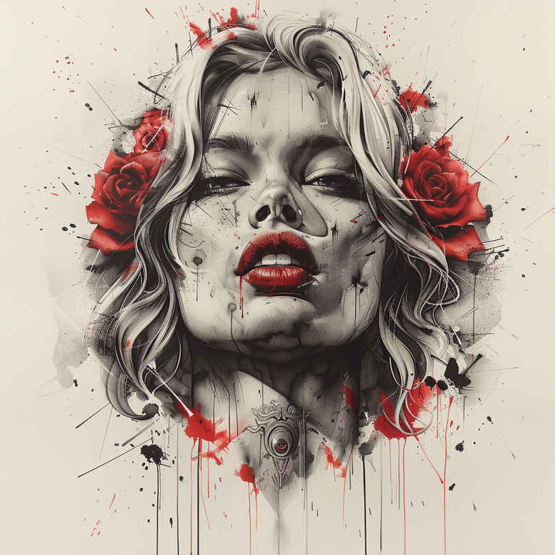This concept presents a rose and face portrait rendered in a moody black and grey palette with vivid red accents on the lips and blossoms, a sophisticated tattoo design for collectors seeking drama and elegance. The piece relies on watercolor-inspired washes and soft feathering to achieve a painterly vibe, while crisp linework defines the facial features, hair, and the crown of blossoms. The focal point is a female face, framed by red roses that seem to orbit the temples and jawline, with scarlet lips creating a bold counterpoint to the grayscale shading. Ink splatters and drip effects contribute to an organic, hand-drawn feel, enhancing the sense of motion and emotion. This is an AI-generated tattoo project, reflective of contemporary design explorations that blend fine line technique with broader brush-like shading. Key elements include face, rose, lip, hair, and floral accents; in tattoo terms, the composition supports black and grey with selective red highlights, and is adaptable to a Japanese style tattoo or a realistic tattoo approach. The concept works well for small to mid-size placements and invites variations such as additional bloom clusters, lace-like shading, or a subtle infinity motif woven into the background. For cover-up potential, the dense grayscale shading around the edges can help conceal previous work while the red focal points draw attention to the new design. The piece aligns with terms such as tattoo, meaningful tattoos, rose tattoo design, flower tattoos, custom tattoo design, Japanese style tattoo, black and grey, realistic tattoo, body art, and ink; it also presents opportunities for lotus flower tattoo, infinity tattoo, tribal tattoo symbolism, and broader storytelling through portrait and floral fusion. In short, this rose and face portrait offers a refined fusion of deliverable portraiture and floral motif, ideal for fans of watercolor realism, bold red accents, and contemporary body art; as an AI-generated project, it invites interpretation and adaptation to personal taste and placement.