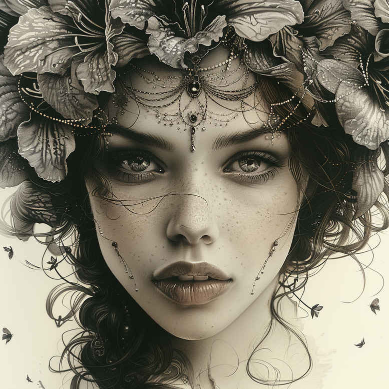 AI-generated tattoo project concept presenting a highly detailed black and grey portrait framed by a wreath of flowers and leaves. Rendered in a realistic tattoo style, the design uses subtle grey washes and fine line tattoo techniques to convey lifelike skin texture, expressive eyes, and delicate forehead jewelry, while the floral crown provides a natural frame that can scale from a small tattoos to a full back piece. The motif of blooms and foliage carries meaning—renewal, memory, grace—and invites personalized symbolism around personal milestones. The composition blends portrait realism with botanical detail, offering versatility from a restrained fine line tattoo approach to a bold, high-contrast black and grey piece, and it nods to Japanese style tattoo through disciplined composition and ornamental rhythm. The potential for pattern in the leaves and petals enhances the design’s visual rhythm, making it suitable for repeated motifs or extended canvases. For cover-up applications, the dark shading around the crown can help obscure existing marks while the crown’s negative space provides room to reconstruct balance and shade. In practice, a tattoo artist can adapt the crown size, adjust line thickness, and rework the jewelry to suit placement on shoulder, chest, or arm, preserving the face as the focal point while letting the flora breathe. This concept aligns with meaningful tattoos, flower tattoos, rose tattoo design, and custom tattoo design, while also accommodating lotus flower tattoo, infinity tattoo, tribal tattoo concepts in a single cohesive idea. It embraces Japanese style tattoo aesthetics with a refined approach and remains effective as black and grey realism or a lighter ink philosophy, a true example of body art and ink. This is an AI-generated tattoo project, illustrating how botanical portrait concepts can be translated into compelling ink ideas ready for artist adaptation.