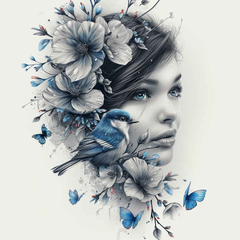 AI-generated tattoo project concept depicting a grayscale portrait of a woman’s face entwined with blossoms and accented by cobalt blue butterflies. The composition relies on fine line tattoo technique and soft grayscale shading to render the skin with lifelike texture, while thin lines delineate petals and hair, creating a delicate yet readable image at small scales. Flowers cascade along the temple and jawline, their petals built from overlapping lines and subtle stippling to suggest depth without heavy contrast, preserving a harmonious balance between negative space and form. Blue butterflies punctuate the piece, serving as color anchors in an otherwise black and grey palette and symbolizing transformation and renewal. The overall mood is ethereal and feminine, suitable for a shoulder, forearm, or upper back placement, and it remains adaptable for a larger sleeve as a cohesive botanical portrait. From a craft standpoint, the tattoo design blends botanical realism with contemporary illustration, employing careful line weight variation, gentle shading, and texture to convey dimension on skin. The concept embraces themes of growth, resilience, and metamorphosis, while remaining versatile for meaningful tattoos and small tattoos alike. It also aligns with trends in custom tattoo design that favor restraint, legibility, and elegance in black and grey ink. If realized by a skilled artist, this image could become a striking rose tattoo design or flower tattoos piece, and it embodies the idea of a personal journey through ink. Although presented as an AI-generated project concept, it offers a solid foundation for a real tattoo design that could be adjusted for individual symbolism and placement; the floral framing gives ample coverage for a potential cover-up and allows density control to adapt to different skin tones and textures. Keywords: tattoo, tattoo design, meaningful tattoos, fine line tattoo, small tattoos, flower tattoos, black and grey, realistic tattoo, body art, ink.