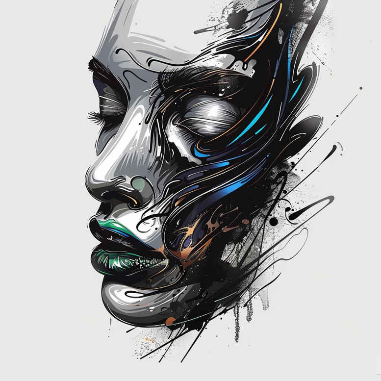 This piece presents a dark portrait rendered in a fine-line black and grey style, with electric blue accents tracing the contours of the face and the surrounding linework that fragments the skin like a controlled ink storm. The central motif is a facial study—nose, lips, and a softened eye—built from delicate strokes that combine to form a portrait that reads as both lifelike tattoo and graphic sculpture. The surrounding splashes and spidery threads create a pattern-like field, suggesting motion and energy while remaining cohesive as a single tattoo design concept. Executed with precise needlework, the design emphasizes negative space and subtle gradations of shading to preserve legibility on skin while offering a strong silhouette for larger areas or as a cover-up beneath older ink. The piece serves as a versatile custom tattoo design suitable for the upper arm, chest, or back, depending on scale, and translates well across styles—from black and grey realism to a stylized Japanese-inspired approach with careful line weights. The blue accents add contrast and modernity, acting as a focal color within a predominantly monochrome palette. For clients seeking meaningful tattoos, the portrait motif can be linked to symbolic meanings—the face as guardian, the lines as a journey, the blue as a spark of memory—while remaining adaptable for small tattoos or extended body art. This concept is an AI-generated tattoo project, providing a strong foundation for a refined and dramatic piece, and because of the heavy blacks it is ideally suited as a cover-up design, where new ink can transform old work into a cohesive, fresh statement. The line-based composition allows artists to map the flow across contours and bone structure, and the graphic, pattern-like elements help unify the piece when scaled, ensuring legibility at different angles and distances. In short, this tattoo design blends precision linework with graphic nuance to deliver a powerful, modern portrait that can accommodate multiple cultural idioms and interpretations, from tribal hints to lotus or floral inflections, without losing its core emphasis on form, shading, and contrast.