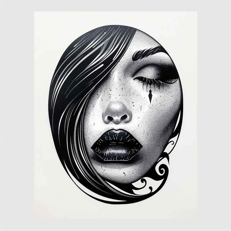 This AI-generated tattoo project proposes a high-contrast black and grey portrait suitable for a cover-up. The composition centers on a woman’s face, framed by flowing hair that sweeps across the forehead and cheek. Deep ink contrasts define the eye, brow, nose, and full lips, while subtle shading creates a realistic sense of depth and texture. A nose ring adds a contemporary accent, and a teardrop detail beneath the eye introduces emotion and narrative. The lower portion integrates ornamental, pattern-like swirls that meld with the jawline, offering a ready-made canvas for cover-up work or seamless blending into existing ink. The piece emphasizes strong linework and smooth gradations of tone, allowing a skilled tattooist to adapt to various placements and skin tones. The pattern element provides a built-in concealment mechanism that can help obscure older tattoos while preserving a striking portrait as the focal point. Key elements include face, hair, eye, lips, nose, and tear, all executed in black and grey with careful consideration of negative space and edge definition. From a technical standpoint, the design relies on layered shading, crisp contours, and subtle halftone-like transitions to achieve a photorealistic effect that remains adaptable for different body areas. Symbolically, the teardrop evokes resilience and emotion; the hair frames the face to guide the viewer’s gaze, while the ornamental lower motif can be extended or reworked to suit personal stories or cultural aesthetics. This concept aligns with meaningful tattoos and can be refined into a custom tattoo design for individuals seeking a bold cover-up piece that balances realism with decorative lineage, meeting the needs of both small tattoos and larger body art projects. As an AI-generated tattoo project, it showcases how modern imaging can translate into a practical, ink-ready design that tattooists can interpret with precision, ensuring a lasting impact across genres such as black and grey realism, Japanese-influenced shading, and fine line accents.