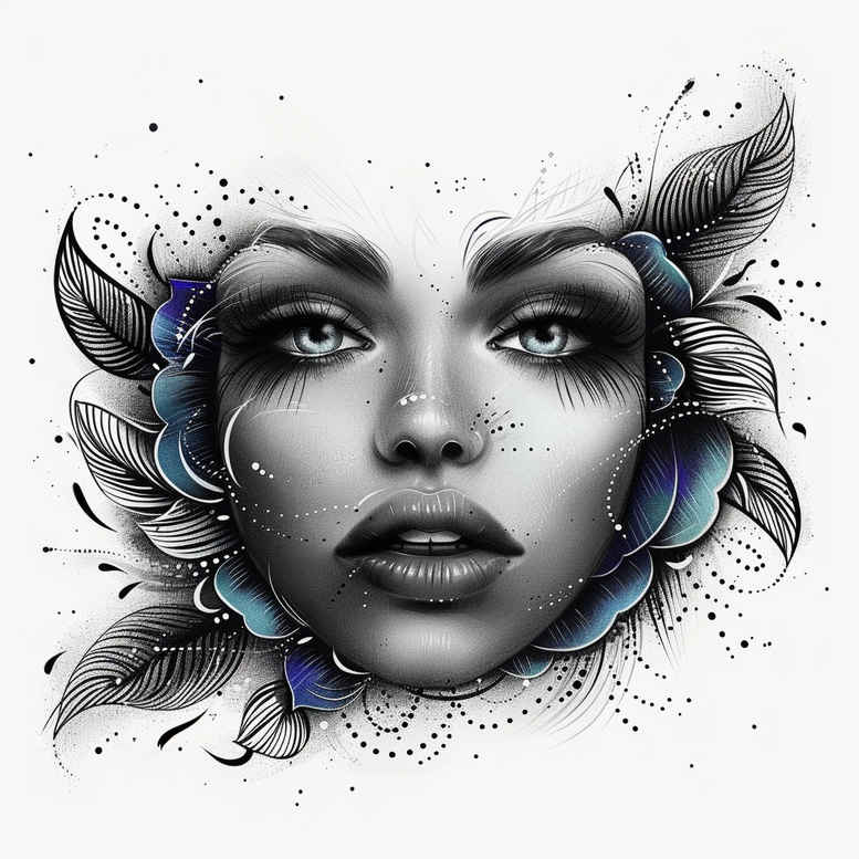 This AI-generated tattoo project presents a photorealistic portrait integrated with botanical motifs, conceived as a versatile concept for cover-up work. The focal element is a lifelike female face rendered in black and grey, with soft transitions across the cheeks, eyes, and lips achieved through deliberate shading and subtle highlights. Surrounding the visage are blue flower petals and stylized leaves that form a delicate halo, creating movement and negative space designed to mask existing ink while remaining elegant on the skin. Fine line work defines each petal contour and leaf vein, while stippling and light splatter patterns add texture without overpowering the portrait’s integrity. The overall composition balances realism with decorative patterning; the floral elements serve as both ornament and camouflage, enabling interwoven dark areas beneath to be concealed by the surrounding shading and soft gradients. The piece leans toward Japanese-inspired symmetry and graphic precision, yet stays firmly within the realm of black and grey realism suitable for adult, timeless body art. This concept is intended as a custom tattoo design that can be adapted for different placements and sizes, with adjustable density of lines, variation in petal color accents, and a portrait likeness tailored to the wearer. It also offers meaningful symbolism: renewal and resilience represented by the blue blossoms encircling a steadfast gaze, pairing well with broader themes such as infinity or tribal motifs when requested. Keywords to maximize discoverability include tattoo, tattoo design, meaningful tattoos, fine line tattoo, lotus flower tattoo, infinity tattoo, tribal tattoo, rose tattoo design, small tattoos, flower tattoos, custom tattoo design, Japanese style tattoo, black and grey, realistic tattoo, body art, ink. If pursued as a cover-up, the surrounding floral halo and the portrait’s shading may be extended to cloak larger marks; the concept provides a solid foundation for a personalized and successful concealment.
