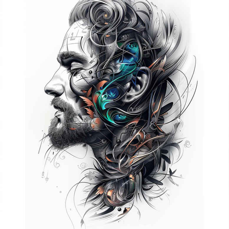 AI-generated tattoo project presents a refined side-profile portrait in black and grey line work, with selective teal accents weaving through the hair and decorative pattern motifs along the neck and temple. The composition centers on the male subject, rendered in crisp fine line technique to evoke movement, texture, and depth in skin and hair. The artist’s approach emphasizes clean negative space and meticulous cross-hatching, allowing the teal elements to provide a modern colour counterpoint without overpowering the monochrome mass. The piece nods to classical portrait studies while embracing contemporary tattoo design language found in Japanese style tattoo and realism-inspired work; the juxtaposition of precise lines and soft gradients gives a tactile sense of skin. The visible elements include the man, his hair flowing, the outline of the face in profile, the ear, and a stream of pattern motifs that cascade behind the neck and into the hairline, creating a dynamic border between figure and ornament. The meaning behind the design is open to interpretation: teal may symbolize vitality or a focal point of memory, while the grayscale grounds the image in timeless portraiture. The overall effect is a bold yet nuanced composition suitable for a standalone tattoo or as a compelling companion to larger body art. From a production perspective, the piece demonstrates how fine line tattoo technique can render intricate portraits with restrained shading and strategic color pops, a concept aligned with meaningful tattoos, small tattoos, and flower tattoos alike. This AI-generated tattoo project explores the dialogue between silhouette and pattern, inviting viewers to consider how ink can capture character through line density, spacing, and intentional negative space. In terms of SEO, the narrative touches on tattoo, tattoo design, meaningful tattoos, fine line tattoo, black and grey, lotus flower tattoo, infinity tattoo, tribal tattoo, rose tattoo design, Japanese style tattoo, realistic tattoo, body art, and ink.