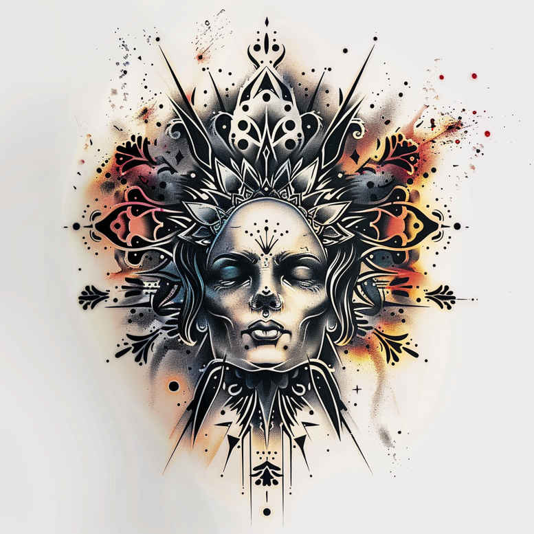 This AI-generated tattoo project presents a striking black-and-grey portrait framed by a lace-like mandala crown and geometric motifs, with floral accents and subtle ink splatters that give the composition energy. The piece centers on a woman’s face rendered in refined linework and smooth grayscale shading to achieve a realistic yet ethereal presence. A crown and mandala halo radiate outward through interwoven symmetrical patterns, while delicate flowers add softness and balance to the design. The overall effect blends portrait realism with ornamental geometry, leveraging bold negative space and micro-detailing to invite close inspection. From a tattoo design perspective, the work emphasizes crisp lines, dot shading, and seamless transitions between dense shadows and bright highlights, producing a sophisticated look suitable for large panels or strategic cover-ups. Symbolically, the queen motif evokes sovereignty and resilience, while the mandala suggests inner harmony and mindfulness; together they convey a meaningful tattoo concept. Given its heavy grayscale palette and dense patterning, this concept is ideal for cover-ups on scarred or dark canvases and translates well to custom tattoo design across Japanese-style influences or modern tribal geometry. This tattoo project showcases how a pattern-rich composition can function as a centerpiece or as part of a sleeve, highlighting the versatility of fine-line techniques in body art. AI-generated means this concept is a starting point for artists seeking a bold, cohesive design; search terms like tattoo, tattoo design, meaningful tattoos, fine line tattoo, lotus flower tattoo, infinity tattoo, tribal tattoo, rose tattoo design, small tattoos, flower tattoos, custom tattoo design, Japanese style tattoo, black and grey, realistic tattoo, body art, ink are embedded to aid discoverability. For very dark canvases, the design is explicitly cover-up ready.