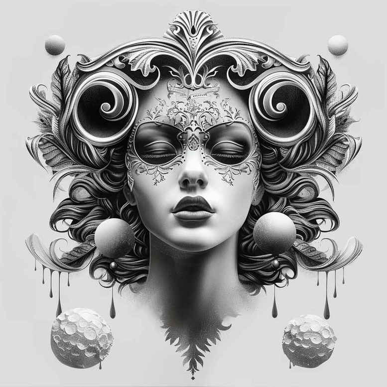 An intricately detailed black and grey composition centers on a serene face framed by a sweeping ornamental headpiece and curling motifs. Rendered in fine line precision, the piece combines symmetry, negative space, and dense shading to create a wearable sculpture that reads as both mask and crown. The central visage emerges with controlled contouring, while the surrounding motifs echo Art Nouveau-inspired flourishes, giving an aura of timelessness. The design reads as a strong statement in black and grey ink, suitable for a larger surface or a bold sleeve as a standalone piece. The symmetrical arrangement invites contemplation of duality, with the headpiece resembling a crown of waves and spirals that flow into hanging drops and orbs, suggested by the image. Its graphic patterns and meticulous line work make it ideal for a cover-up, as the dense shading can effectively mask earlier tattoos or scars. This tattoo design aligns with modern fantasy-portrait aesthetics and can be adapted into Japanese-inspired or tribal-tinged interpretations, depending on the client’s history with ink. It also serves well as a meaningful tattoo for those seeking a regal, mysterious motif, or as a customizable foundation for additional elements like lotus flower tattoos, infinity motifs, or florals. In terms of technique, expect a blend of crisp line work, smooth gradient shading, and careful layering to achieve depth without overpowering the composition. This AI-generated tattoo project demonstrates how fine line approaches and ornamental patterns can translate into a striking body art piece, perfect for cover-up purposes. The language here intentionally embraces stylistic versatility while maintaining a singular focal point—an expressive, timeless tattoo design suitable for both first-timers and experienced collectors.