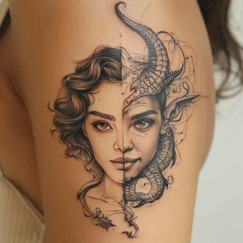 This concept fuses a portrait of a woman with a dragon into a cohesive black-and-grey tattoo design for the upper arm. Executed with a refined fine-line approach, the piece uses crisp facial features and flowing hair on the left while the dragon’s sinuous body and scales wrap to the right, creating a dramatic, balanced composition that reads clearly from a distance yet rewards close inspection. The artist employs a combination of precise line work, gentle cross-hatching, and micro-stippling to build depth, with controlled contrast maintaining legibility on skin as it ages. The juxtaposition of serenity in the woman’s expression with the dragon’s archaic movement suggests themes of duality, protection, and personal metamorphosis—narratives many clients seek in meaningful tattoos. The design nods to Japanese-inspired silhouettes and tribal-influenced tension between human and mythic forms, while staying adaptable to contemporary Western tastes through clean, wearable contouring. Placed on the upper arm, the piece can be scaled up for a larger sleeve or pared down for a mid-bicep motif, making it versatile for various body shapes and pain tolerances. For those exploring cover-up possibilities, the dense black shading and strong contours offer robust camouflage options for existing scars or tattoos while preserving a bold silhouette. This is an AI-generated tattoo project created to illustrate a custom tattoo design that merges portraiture with mythical elements into a single, arc-like composition that can flow with the limb’s natural movement.