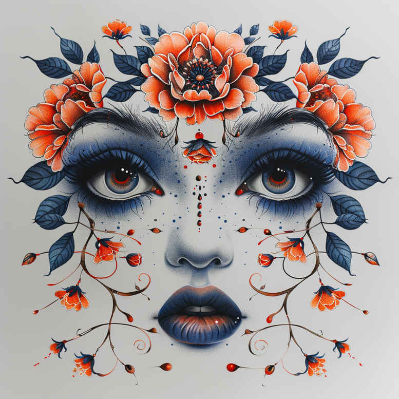 This AI-generated tattoo project presents a refined illustrative concept that merges realism with decorative flora into a cohesive facial portrait. The central motif is a tranquil face rendered with soft shading and blue ink accents that lend a cool, contemplative mood around the eyes and jawline. A crown of orange roses sits gracefully atop the head, interlaced with dark leaves and slender vines that trace along the cheeks and temples, forming a symmetrical frame that emphasizes rhythm and balance. Subtle dotwork, micro-splatter, and a light lace-like pattern embellish the surface, turning the composition into a graphic pattern without sacrificing the clarity of the figure. The color relationship — vivid orange, deep blue, and muted greys — creates drama while remaining highly wearable, a hallmark of modern black and grey and color tattoo traditions. Although the design reads as a portrait, the floral elements tether it to timeless symbolism: growth, renewal, and the beauty of change, with the roses acting as a classic rose tattoo design anchor within a larger body-art narrative. The piece leans on fine line tattoo techniques to achieve crisp outlines and delicate shading, allowing it to scale from small tattoos to larger placements on the arm, chest, or back while preserving clarity of form over time. For collectors seeking meaningful tattoos, this concept offers a versatile template that can be adapted into Japanese style tattoo or Western botanical motifs, or reimagined as a lotus flower tattoo and infinity tattoo hybrid, depending on client preference. The proposal also demonstrates how AI-generated concepts can inform custom tattoo design practice, offering precise patterning guidance, motif placement, and color planning that indie artists can translate into skin with confidence. As a complete package, it blends a modern geometric sensibility with organic floral imagery to deliver a striking, gallery-ready tattoo design that respects tradition while inviting personal interpretation. Due to the graphic pattern elements and floral framing, the motif adapts well to cover-ups where incoming color can blend with underlying lines. Artists can experiment with line weight, gradient shading, and layering to preserve readability on different skin tones. The crown of blossoms serves as a focal anchor while the face remains the heart of the image. In terms of tattoo design history, the composition nods to Japanese style tattoo silhouettes and tribal linework in its bold contouring, yet keeps a contemporary sensibility through delicate dotwork and botanical detailing. The research behind this concept emphasizes the enduring appeal of flower tattoos and portrait tattoos as meaningful tattoos that convey personal narratives. The AI-generated nature of the concept positions it as an inspiration rather than a final stencil, inviting tattooers to customize proportions, pose, and color emphasis to suit individual anatomy and aesthetic goals. In practice, the design translates into a versatile, timeless image that can carry intimate symbolism for clients, while remaining visually striking in both color and monochrome formats. The result is a refined body art concept that demonstrates how ink, line, and pigment can work in concert to produce a sophisticated tattoo design that resonates with wearers seeking expressive, meaningful tattoos.