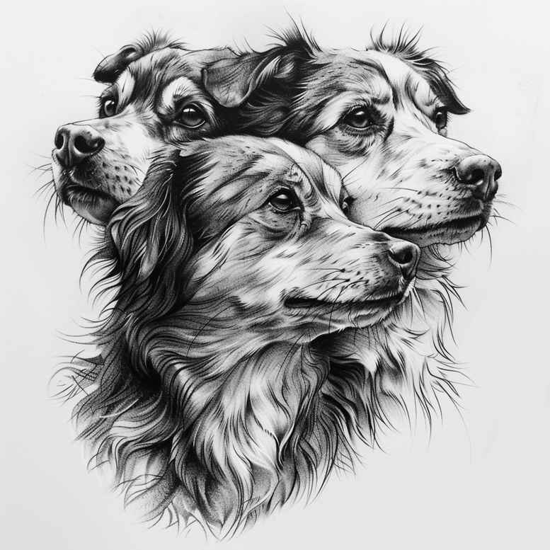 This is an AI-generated tattoo project featuring three dog heads rendered in black and grey pencil-style shading. The composition centers on three canine profiles, each turned slightly, creating depth and unity within a compact, portrait-inspired design. Realistic line work and soft gradations reproduce fur texture and expressive eyes, while crisp outlines preserve clarity for tattoo ink on skin. The piece works as a standalone tattoo design and also serves as a versatile starting point for a custom tattoo design, suitable for placement on forearm, shoulder, or calf; due to its density of shading, it is especially effective as a cover-up for existing work, since the darker tones can effectively mask underlying lines. The symbolism of dogs—loyalty, protection, companionship—adds meaningful tattoos potential, making it attractive for clients seeking a narrative piece rather than purely decorative ink. The technical approach emphasizes black and grey ink, layering tones to achieve depth: midtones define fur texture, while dark accents suggest depth in the contours of the snout and ears, and selective highlights bring life to the eyes. The design remains adaptable to Japanese style tattoo or more traditional realistic tattoo approaches, depending on client preference, and can scale from small tats to larger memorial compositions. The image demonstrates how AI-inspired concepts can inform tattoo artistry, presenting a refined concept that blends fine line tattoo aesthetics with realism, making it relevant to topics like tattoo design, meaningful tattoos, and the broader discourse on ink, body art, and custom tattoo design. For those exploring small tattoos or flower-inspired pieces, the straightforward silhouette of three dogs offers a timeless motif; while not a floral pattern itself, the composition happily coexists with lotus flower tattoo, rose tattoo design, and other symbolic elements should the client wish to expand the piece. Overall, this AI-generated project showcases the synergy between digital concepting and inking, inviting collaboration with tattoo artists to finalize line density, shading and placement.