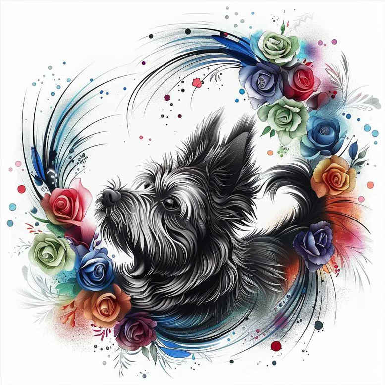 This AI-generated tattoo concept presents a watercolor-inspired portrait of a dog head framed by a spray of roses and painterly color bursts. The composition centers on a grayscale dog rendered with fine shading to capture fur texture and attentive expression, while the surrounding blossoms execute a lively counterpoint with pinks, blues, and oranges in loose washes and crisp ink lines. The juxtaposition of meticulous animal realism and fluid floral abstraction creates a design that reads clearly at skin scale yet rewards close inspection, a hallmark of strong tattoo design. Symbolically, the dog conveys loyalty and companionship; the roses symbolize affection, renewal, and memory, allowing this piece to function as a meaningful tattoo for commemorations or daily reminders of devotion. Technically, the piece relies on controlled line work for the animal silhouette to maintain legibility across sizes, paired with watercolor-style shading for the petals to convey depth without muddying the image on skin. The floral spray can wrap around a limb or shoulder blade, enabling a dynamic flow that complements body contours. This concept translates well into both black and grey tattooing with selective color accents, or a fully polychromatic interpretation depending on client preference. As an AI-generated tattoo project, it demonstrates how digital sketches can inform traditional tattoo workflows, from stencil preparation to ink layering, while preserving the emotional resonance of a custom tattoo design. Potential placements include forearm sleeves, chest panels, or back compositions, where the pattern and line work guide the eye through curves and angles. Keywords to search include tattoo, tattoo design, meaningful tattoos, fine line tattoo, lotus flower tattoo, infinity tattoo, tribal tattoo, rose tattoo design, small tattoos, flower tattoos, custom tattoo design, Japanese style tattoo, black and grey, realistic tattoo, body art, ink.