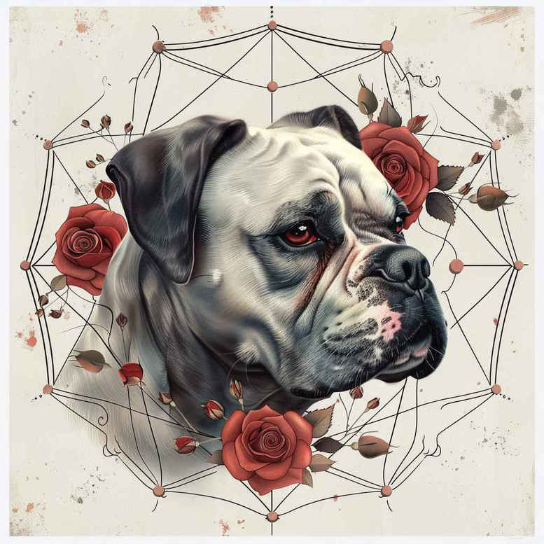 An AI-generated tattoo project presenting a bulldog head in black and grey realism, framed by red roses and an intricate geometric pattern; the design blends soft shading with crisp linework to create a versatile concept suitable for sleeves, backpieces, or small placements. The bulldog’s muzzle and jowls are rendered with careful tonal transitions to convey weight, texture, and a watchful expression, while the roses provide bold color accents and timeless symbolism of loyalty, love, and renewal. Surrounding the central figure, a lattice of interlocking lines and circular motifs introduces a geometric pattern that anchors the composition and offers pathways for future extension or modular placement. The overall effect is a contemporary fusion of realism, floral symbolism, and geometry, making it an appealing choice for meaningful tattoos with lasting impact. Techniques emphasize fine line detailing in the petals and leafwork, subtle skin texture, and cross-hatching for depth, balanced by broad black and grey shading that grounds the portrait without washing out the floral elements. This concept is a strong candidate for a custom tattoo design, adaptable to different placements and skin tones, with room for color accents if desired. It also works as a cover-up concept when adjusted for surrounding shading and line density. As an AI-generated tattoo project, it demonstrates how machine-generated ideas can inspire artists to explore rose tattoo design, bulldog portraiture, and geometric precision within a cohesive black and grey palette, while remaining highly suitable for meaningful tattoos, small tattoos, and ink-based body art.