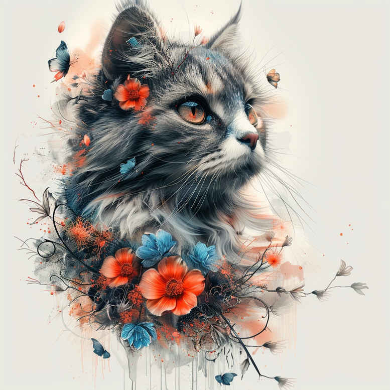 This is an AI-generated tattoo project concept featuring a watercolor cat portrait entwined with blossoms. The main subject is a gray tabby rendered with soft ink washes that bleed into negative space, a hallmark of watercolor tattoo design. A cascade of cobalt-blue and orange-red flowers winds around the cat, with splashes that imply motion, life, and spontaneity. The color palette blends cool tones with warm florals for a vibrant yet balanced look that remains legible when inked on skin. While this concept leans toward color, it can be adapted into a fine line tattoo or a black and grey rendition for a more understated outcome, making it flexible for different client preferences. The composition works well on forearm, upper arm, shoulder, or calf, with the blossoms forming a frame that guides the eye to the cat’s attentive gaze. Symbolically, the cat speaks of curiosity, independence, and companionship, while the blossoms symbolize growth and renewal; together they convey a meaningful tattoo design about harmony with nature and personal guardianship. From a technique standpoint, the piece favors layered washes, delicate linework for details, and careful color planning to preserve luminosity, with the option to push toward a more realistic tattoo or retain a painterly, Japanese style influence. As an example of a custom tattoo design, it sits comfortably within the broader world of flower tattoos and animal portraits, offering room to adjust scale, placement, and the balance between cat portrait and floral frame. Being AI-generated, it demonstrates how digital experimentation can translate into tangible body art concepts while allowing artists to tailor symbolism, size, and ink saturation to individual meanings. The result remains versatile for meaningful tattoos, adaptable to small or medium sizes, and ready to evolve with the wearer’s story. Placement guidance suggests forearm, upper arm, or shoulder for a flowing frame; eyes may be highlighted for character, blossoms can taper toward edges for readability at smaller sizes, and saturation can be adjusted for longevity. For artists, this concept serves as a solid base for a custom tattoo design that respects anatomy and skin dynamics, with room to explore Japanese style influences, floral motifs, and animal portraits. The AI origin is noted to acknowledge its digital genesis while inviting collaboration to translate painterly softness into enduring ink, making it suitable for those seeking meaningful tattoos that combine nature and pet companionship with contemporary body art.