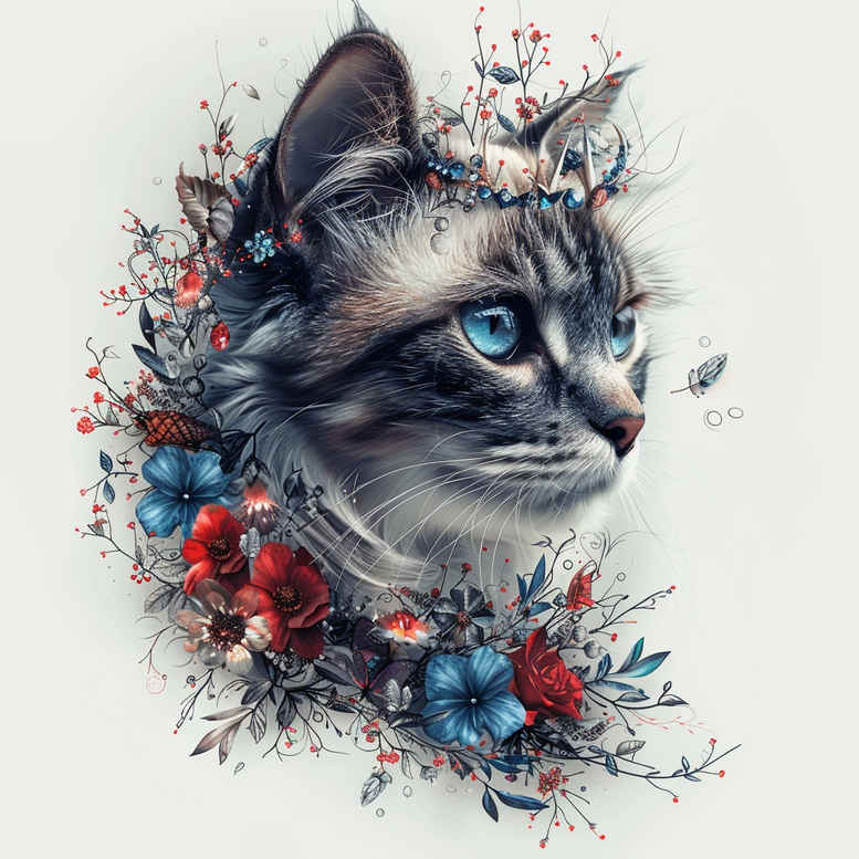 AI-generated tattoo project concept presenting a lifelike cat portrait rendered in watercolor, its piercing blue eye drawn with fine-line precision while a frame of red and blue flowers and delicate branches encircles the figure. The fur is built with meticulous line work that defines texture and is layered with translucent washes to evoke painterly depth and a soft luminosity on skin. Floral accents provide a vibrant color contrast against the cat’s muted fur, anchored by careful shading that preserves form without compromising airiness. The composition blends realism with decorative pattern, offering flexibility for a small standalone piece or expansion into a sleeve or back piece. The floral frame serves as ornament and boundary, allowing integration of alternate motifs such as a lotus flower tattoo or a rose tattoo design to deepen symbolism. Technically, the piece emphasizes clean line work where appropriate, with bold color blocks and gradient transitions achieved through layered washes—well suited to fine line tattoo aesthetics when translated to skin. The concept is adaptable to various placements, including forearms and calves, thanks to positive negative space and scalable elements, and it remains faithful to a custom tattoo design that honors the subject’s personality: independence, curiosity, and vitality. As an AI-generated tattoo project, it demonstrates how digital ideation can inform tattoo-ready artwork, enabling clients and artists to test scale, color relationships, and line weight before committing to ink, while inviting personalization such as color tweaks or alternative floral choices. The design aligns with trends in flower tattoos and animal portraits, offering a durable, timeless motif that blends realism with artful patterning and bold color, suitable for meaningful tattoos and a stylish body art statement.