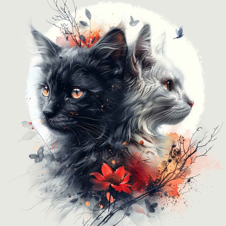 AI-generated tattoo project concept: a pair of cats—one black, one white/gray—framing a vivid red flower, all rendered in a fluid watercolor style. The composition sits within a pale circular backdrop, lending a sense of cohesion and focus. The two felines express companionship and vigilance, their fur rendered with soft gradations that edge toward realism while preserving painterly abstraction. The red bloom anchors the scene with a warm, dramatic contrast, inviting interpretation as a rose or lotus depending on client symbolism. The overall approach favors fine-line precision for clean ink lines, with feathered shading and gentle transitions that maintain legibility when scaled for forearm, calf, or shoulder placements. From a technical standpoint, the piece combines controlled linework with looser washes, producing a design that can be executed in black and grey for a timeless look or in selective color to highlight the flower. The concept is ideal for meaningful tattoos that celebrate friendship, protection, and the beauty of nature, with the cats representing guardianship and duality. Its adaptable layout makes it suitable for small tattoos or larger sleeves, and the circular element can be cropped or extended to fit different body areas. This is an AI-generated tattoo project designed to spark conversation and experimentation in ink: a marriage of illustrative finesse and contemporary watercolor aesthetics. If desired, the piece can be translated into a culturally specific style or further refined for a cover-up-friendly concept, though this image itself is not inherently a cover-up.