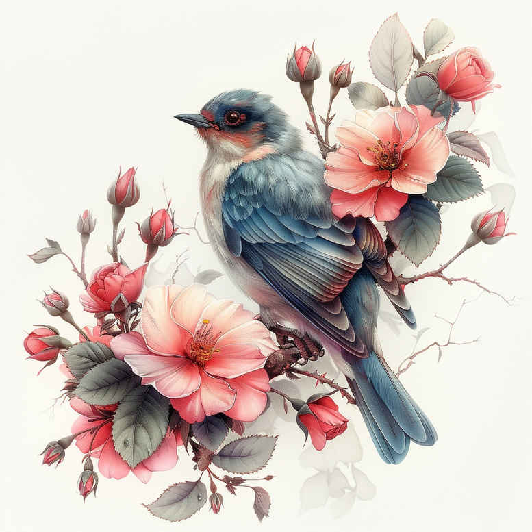 AI-generated tattoo project concept. This design pairs a softly rendered blue bird with a cluster of pink blossoms perched on a slender branch, realized in a watercolor technique that blends feathered texture with translucent washes. The central motif is the blue bird, shown with fine line accents to capture delicate plumage and a thoughtful gaze, while the blossoms form a luminous halo of color around the creature. Leaves in muted sage tones ground the composition, offering a natural frame that works on the forearm, shoulder, or calf. The layout favors generous negative space to preserve airiness and readability on skin, with gentle gradients between blues and pinks creating a luminous effect that suggests motion and life. The linework remains crisp enough to read at smaller scales, making it suitable for fine line tattoos or larger pieces where the color washes can breathe. In terms of meaning, the blue bird is a classic emblem of happiness, hope, and renewal, while pink blossoms symbolize beauty and the ephemeral nature of life, together forming a meaningful tattoo design about growth, resilience, and daily wonder. Technique-wise, it leans into a fine line foundation with watercolor shading to achieve depth without bold borders, a nod to Japanese-inspired aesthetics through balance and natural motif pairing, while maintaining a modern realism through careful layering of color. Ink density relies on controlled saturation to ensure longevity and legibility, adaptable to various placements and scalable from small floral accents to expansive nature scenes. As an AI-generated tattoo project concept, it demonstrates how heritage symbolism can fuse with contemporary ink techniques to create a refined, personal emblem that remains versatile for future refinements. The concept is suitable for both intimate small tattoos and larger, flowing body art, and can be tailored to suit individual preferences.