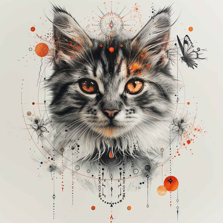 AI-generated tattoo project concept: a cat portrait rendered in meticulous black and grey shading, accented by a watercolor wash and bright orange highlights. The focal point is a lifelike feline face whose fur gradations convey softness and volume, while the eyes glow with amber warmth. Surrounding the head, an intricate mandala emerges from a lattice of fine lines, circles, dots, and splashes, blending realistic animal portraiture with geometric pattern. The watercolor washes drift outward, creating a painterly atmosphere that contrasts with the crisp ink of the mandala rings and spokes. This concept leverages the strengths of fine line tattoo and black and grey realism, making it adaptable to a small to mid-size placement such as the forearm, calf, or shoulder, and it reads well as a standalone piece or as part of a larger sleeve. For tattoo design discussions, it marries a classic cat motif with a contemporary circular frame, allowing the artist to explore controlled shading, feathered transitions, stippling, and precise dot work within the pattern. The symbolism of the cat often denotes independence, curiosity, guardianship, and mystery, while the mandala conveys balance and mindfulness; together they create a meaningful tattoo design that can carry personal significance for the wearer. As an AI-generated tattoo project, this concept invites experimentation with line weight variation, negative space within the mandala, and selective color accents to achieve a cohesive body art piece. The palette can be kept strictly black and grey to emphasize form, or subtle color transitions can be added to enhance the watercolor effect while preserving a timeless aesthetic suitable for new tattoos or thoughtful cover-up revisions. This concept aligns with trends in tattoo design that celebrate meaningful tattoos, fine line tattoo craftsmanship, and black and grey realism in modern body art, and it can inspire designs across Japanese style tattoo, tribal tattoo, and floral themes such as lotus flower tattoo or rose tattoo design.