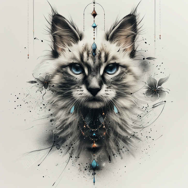 This AI-generated tattoo project concept presents a cat portrait crafted in a restrained watercolor-inspired black and grey palette. The central figure is a lifelike feline head, its icy blue eyes rendered with fine line precision and subtle feathering, capturing a moment of quiet alertness. Surrounding the head is an ornamental treatment of watercolor splashes and soft gradients that bleed into negative space, creating a halo-like symmetry and lending the piece a painterly quality that translates well to skin. A slim beaded necklace sits at the lower edge of the composition, providing a vertical anchor and a hint of jewelry-inspired tattoo design that can be used to personalize the piece. The overall effect blends realism with graphic texture: controlled linework defines fur where necessary, while broader washes add depth and dimensionality, allowing the design to remain legible as a small tattoo or to scale gracefully for larger placements. Because this is an AI-generated tattoo project, it functions as a concept sketch that invites custom refinement by a tattoo artist, including adjustments to line weight, shading, and pattern density. The pattern-like splatters and the mirrored compositional rhythm evoke both Japanese-style restraint and contemporary tattoo trends, offering meaningful tattoo possibilities for animal lovers, symbolism enthusiasts, and those seeking a subtle yet expressive body art piece. In practice, this design can be adapted into black and grey realism, a fine line approach, or a mixed technique, while maintaining the cat’s portrait integrity and the intrigue of the pattern-inspired background. It also supports small tattoos and larger murals alike, with clear focal points—the eyes, the necklace, and the flow of ink—so it remains versatile for client preferences and placement constraints.
