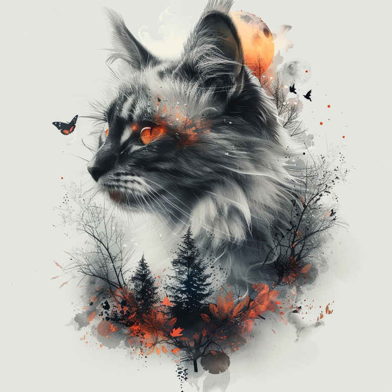 AI-generated tattoo project concept presenting a cat head rendered in black and grey watercolor, merging with delicate forest silhouettes and bursts of orange blossoms. This pattern-rich composition uses fine line detailing to convey fur texture and the wispy atmosphere of a woodland scene, with soft splashes and controlled linework that suggest movement and life. The central feline figure acts as a guardian of the woods, its gaze anchored by subtle shading that dissolves into the surrounding trees, creating a cohesive composition suitable for a small-to-medium tattoo. The orange accents provide a warm contrast against the monochrome palette, drawing the eye toward the blossoms and establishing a focal point within the design. From a tattoo design perspective, the concept nods to Japanese style tattoo and black and grey realism while retaining a modern watercolor sensibility, capable of being rendered as a stand-alone portrait or expanded into a larger piece. The idea explores themes of independence, curiosity, and renewal, with the cat symbolizing resilience and the forest representing mystery and growth; the flowers introduce organic motion and softness. In technique, the approach blends thin-line fur detailing with smooth gradient shading for depth and selective splatter textures to evoke foliage, air, and texture without compromising legibility, making it well-suited for the trend of fine line tattoo and flower tattoos. The composition is adaptable to various placements and scales, and, with careful color placement, can be transformed into a dotwork or realistic interpretation. Overall, this concept invites ink artists to translate the balance of realism and abstraction into a tattoo that remains timeless, meaningful, and versatile across body art, ink, and wearable art.