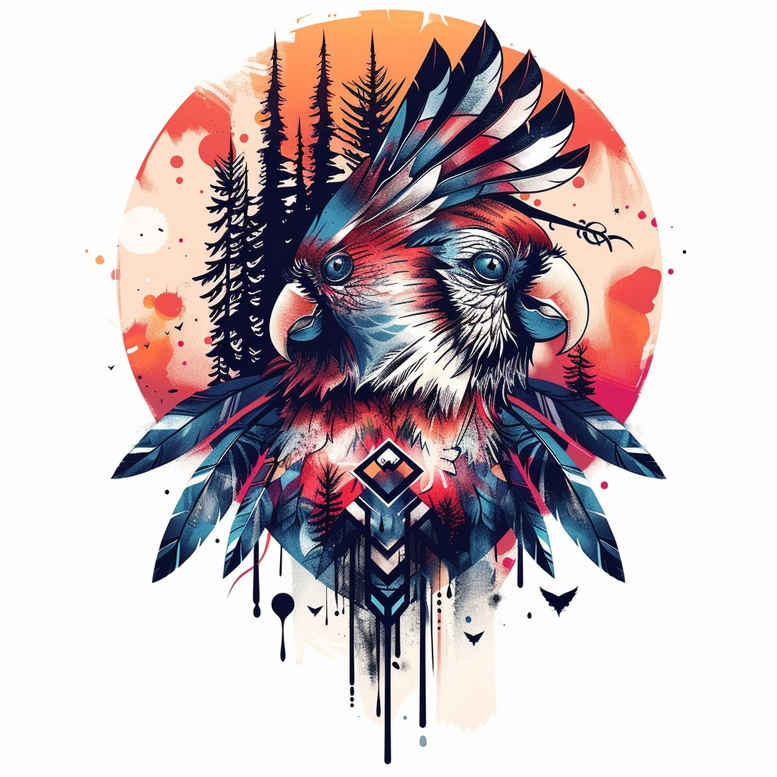 AI-generated tattoo project concept portraying a parrot rendered in a bold watercolor style. The composition centers a vibrantly colored parrot perched within a warm orange circular sun, creating a strong focal point and contrast against the blue and red plumage. Feathers are shaped with fluid washes and precise linework to capture movement and texture, while a geometric, mandala-inspired chest motif introduces a graphic pattern that anchors the piece. Drips and splashes extend from feathers and circle, evoking ink blooming on skin and lending energy to the design. The palette emphasizes saturated blues and crimson reds with deep blacks to ensure bold legibility in color tattoos and translate well on different skin tones. Symbolically, the parrot conveys vitality, curiosity, and freedom; the circular sun hints at cycles, renewal, and timeless continuity. The design nods to Japanese style tattoo aesthetics through the balance of organic feather form and sharp geometric detail while retaining a contemporary edge suitable for a standalone piece or a sleeve. In terms of technique, the concept blends watercolor washes with fine line detailing to preserve clarity in small tattoos while providing depth for larger works. This is an AI-generated tattoo project, offering a versatile base for commission: it can be adapted to integrate a rose tattoo design or lotus flower tattoo, or augmented with infinity or tribal motifs depending on personal symbolism. The concept suits flower tattoos, small tattoos, and other custom tattoo design explorations, presenting a modern take on color realism within a black and grey or full-color context as needed. The finished result would work well on various body areas, serving as a striking centerpiece or focal point thanks to its bold color, graphic pattern, and strong silhouette.