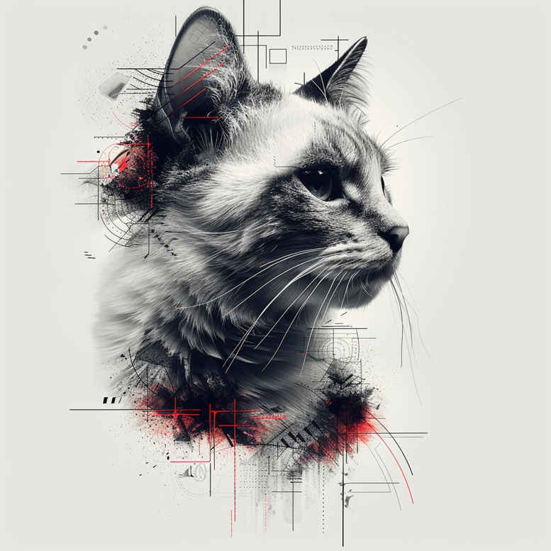 This AI-generated tattoo project presents a cat portrait executed in fine-line black and grey, accentuated by precise geometric linework and selective red ink splashes. The focal point is a lifelike feline head rendered with delicate shading, crisp contour lines, and subtle fur texture that read clearly at small scales. Surrounding the subject, angular line motifs and a grid-like framework introduce a contemporary, graphic backdrop that contrasts with the organic curves of the cat. The red accents act as a controlled splash of color, guiding the eye to the ear and neck while preserving balance with the grayscale values. Designed as a small-to-medium tattoo concept, it adapts well to the forearm, calf, or rib area and offers versatile options for a cover-up where darker elements can be integrated into the negative space. Technically, the piece emphasizes careful line economy, smooth transitions between black and grey tones, and strategic negative space to maintain legibility as ink ages. The pattern-driven background reinforces a modern aesthetic and invites additional motifs if desired. Symbolically, the cat embodies independence, curiosity, and resilience, while the geometric framework suggests order and intent, echoing the careful planning behind any meaningful tattoo design. This concept serves as a starting point for a custom tattoo design that can incorporate elements like lotus flower tattoo, infinity tattoo, tribal tattoo, rose tattoo design, flower tattoos, small tattoos, and other motifs into a cohesive black and grey, realistic tattoo palette. It offers potential as a Japanese style tattoo and confirms that meaningful tattoos can be crafted as fine line tattoos with ink on body art. As an AI-generated tattoo project, it demonstrates how digital concepting can translate into tattoo-ready ink, balancing graphic patterns with natural form.