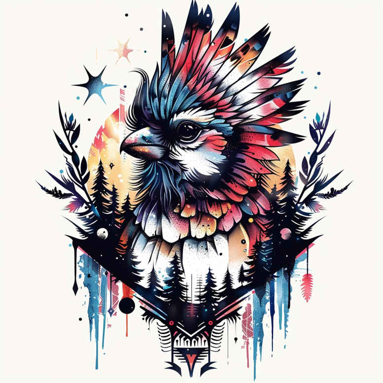 Presented as an AI-generated tattoo project concept, this design fuses a phoenix head rendered in a saturated watercolor wash with precise geometric feather work and organic branch motifs. The focal point is the phoenix’s head, its gaze framed by a crown of stylized plumage in reds, teals, and midnight blue, while sharp black outlines give structure to the color blocks. Surrounding feathers fan outward in layered triangles and lattice-like geometry, creating a striking tension between fluid pigment and crisp linework. Color drips descend from the tips of the plumage, injecting motion and a contemporary energy without sacrificing legibility or timeless appeal. The composition nods toward geometric tribal tattoo influences while remaining legible as a standalone piece or adaptable into a larger sleeve or back piece. From a tattoo design standpoint, the piece blends fine line detailing for the outlines with broad color fields achieved through watercolor technique, and uses black ink to anchor the geometric facets so the image holds over time on skin. Symbolically, the phoenix speaks to rebirth, resilience, and transformation, making this a meaningful tattoo choice for those embracing renewal or new chapters. The color palette—vibrant reds, electric blues, and graphite blacks—enhances contrast and readability when scaled, while the negative space around the head creates breathing room crucial for a clean interpretation. Though inspired by influences including Japanese-style linework and contemporary patterns, the core concept remains versatile for small tattoos or expansive body art. This AI-generated tattoo project concept demonstrates how watercolor washes can harmonize with geometric precision to produce a memorable tattoo design, with keywords woven for discoverability in portfolios and search contexts. The concept serves as a flexible blueprint for clients seeking meaningful body art that marries traditional motifs with modern execution, ready to transition from concept to skin.