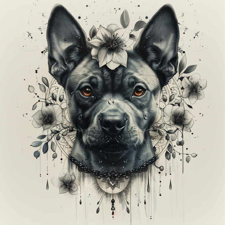 AI-generated tattoo project presents a refined black and grey dog portrait framed by a floral crown, set against an abstract pattern of ink splashes. The composition centers on a lifelike canine head with attentive eyes and a dignified expression, rendered in grayscale to preserve realism while the floral crown introduces a botanical artistry that reads as a wearable pattern. The bouquet features blossoms and leaves arranged as a crown atop the dog, with additional foliage forming a soft frame that blends into the surrounding splatters, creating a cohesive pattern that can read both as portrait and ornament. The technique marries fine line shading for fur and petals with broad, wash-like washes that evoke watercolor texture, a hallmark of contemporary tattoo design. This concept sits squarely in black and grey realism, offering a versatile base for small to medium placements and for clients seeking meaningful tattoos that commemorate a companion. For those exploring a custom tattoo design, the piece invites personalization of species, crown details, and leaf motifs to reflect individual symbolism—loyalty, memory, renewal—while remaining adaptable to Japanese style tattoo influences or a more graphic, ink-forward approach. By embracing an AI-generated preview workflow, the project demonstrates how digital concepts can translate into tattoo-ready guidelines, balancing sculpture-like form with decorative patterning for lasting impact on skin. In terms of keywords, the model aligns with tattoo, tattoo design, meaningful tattoos, fine line tattoo, lotus flower tattoo, infinity tattoo, tribal tattoo, rose tattoo design, small tattoos, flower tattoos, custom tattoo design, Japanese style tattoo, black and grey, realistic tattoo, body art, ink. If the client desires a darker silhouette to facilitate a cover-up, this pattern-rich concept can be intensified to suit old ink while preserving the overall composition. This making it a compelling starting point for a real-world tattoo project.