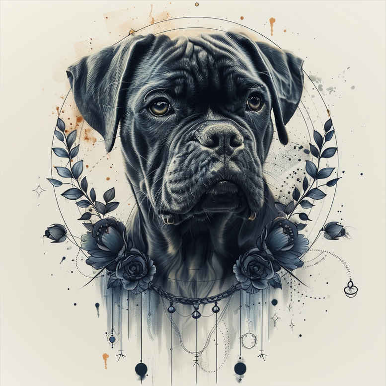 This is an AI-generated tattoo project concept featuring a dark dog portrait framed by a floral wreath. Rendered in black and grey with subtle blue accents, the design blends realism with decorative botanical motifs and watercolor drip details along the lower edge. The central dog’s gaze conveys loyalty and guardianship, while the wreath of leaves and blossoms surrounding the head suggests memory, honor, and the cycle of life. The composition relies on crisp outlines and measured shading to preserve clarity for both small tattoos and larger canvases, making it suitable for cover-up work where bold black areas can mask old ink. The drips and botanical elements introduce a contemporary edge that can be adapted to a Japanese style tattoo or reinterpreted as a more traditional floral piece, depending on client preference. The concept remains versatile for a custom tattoo design: it can be scaled down to a fine-line tattoo on the forearm, or expanded into a sleeve or back piece with additional florals, waves, or symbolic accents such as lotus flower tattoo motifs or infinity tattoo cues. Given its dark massing, the tattoo design offers strong contrast and a lasting silhouette that remains readable with aging, while still leaving room for subtle color if desired. The piece embraces patterning through repetitive floral motifs and decorative leaves, enabling a coherent flow around the portrait when applied to curved body surfaces. The design supports practical considerations for cover-up work, such as hiding previous tattoos or discolorations beneath heavy negative space, while allowing the new ink to establish a bold focal point. For tattoo collectors seeking meaningful tattoos, this concept provides a flexible foundation for a custom tattoo design, adaptable to various scales and settings, from fine-line accents to more substantial black-and-grey compositions; it can be expanded with additional motifs, such as lotus flowers or abstract symbols, to suit personal narratives. Finally, this is an AI-generated tattoo project concept intended to inspire artists and clients alike, illustrating how animal portraiture fused with floral patterning can yield striking body art and versatile ink across styles.