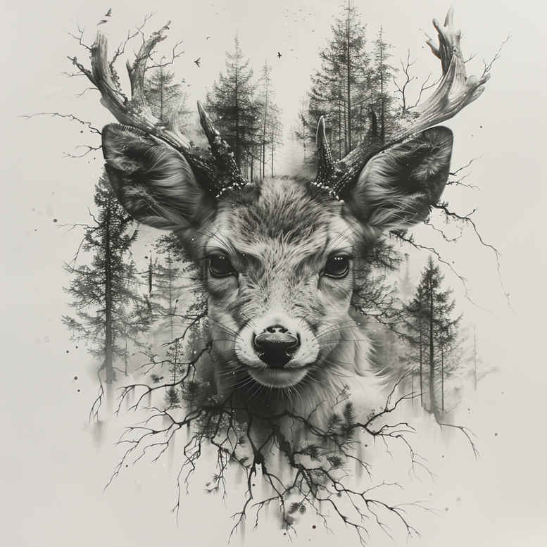 Rendered in black and grey, this forest stag tattoo concept places a deer’s head and broad antlers at the heart of a living grove. The forest is suggested by slender tree silhouettes that dissolve into soft shading, creating a timeless atmosphere that anchors the piece in nature while letting the central figure breathe. Executed in refined fine line technique, the composition balances crisp outlines with graduated shading and subtle stippling to achieve depth without becoming overpowering. The deer motif symbolizes gentleness, endurance, and a personal rite of passage, while the surrounding pines and negative space evoke growth, resilience, and a connection to ancestry. The design reads well as a standalone tattoo or as the focal point within a larger body-art project, and it easily adapts to broader themes such as Japanese style tattoo through a few directional tweaks, or to a black and grey realism approach as a natural extension of a small tattoo into a larger sleeve. For those seeking meaningful tattoos, this concept is versatile for placement on the forearm, upper arm, shoulder blade, or back, with line weights adjustable to suit skin tone and age of existing ink. The piece fuses nature-inspired imagery with contemporary line work, allowing the deer to stand out against a forest-framed background while preserving legibility on the skin over time. Because the composition leans on high contrast and precise line control, it is particularly effective as a cover-up design, capable of concealing older ink beneath strong negative space and bold silhouette. This is an AI-generated tattoo project concept that demonstrates how natural forms can be translated into a timeless, refined black-and-grey tattoo design, with room for customization in ink density, scale, and motif integration such as a lotus flower tattoo or abstract floral elements if desired.