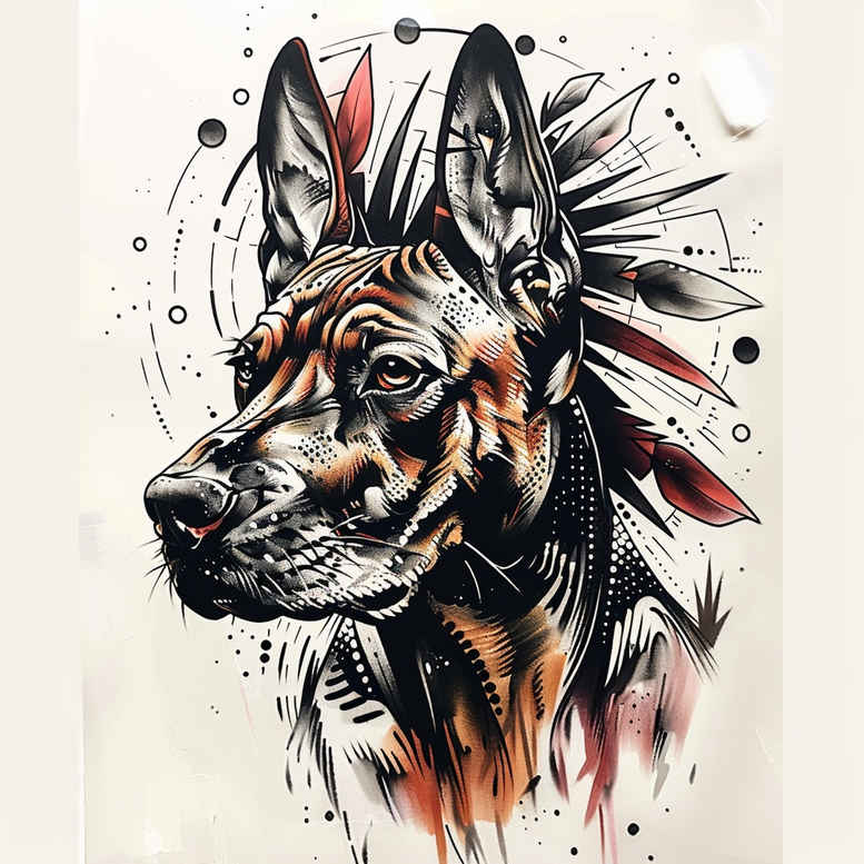 This AI-generated tattoo project presents a German Shepherd portrait rendered in bold linework with color washes that mimic watercolor ink. The composition centers on a powerful canine head, fur suggested with layered browns, blacks, and whites, highlighted by selective red accents and crisp edges. Behind the subject, abstract splashes and radiating lines create motion and a contemporary edge while preserving legibility for tattooing. The approach blends realism with graphic geometry, producing a design that scales from small placements to larger back or sleeve layouts. The visible elements are the dog head, the ink splashes, and the prominent outlines, all harmonized by a full color palette that relies on contrast and edge definition rather than heavy shading. The technique favors clean outlines, controlled color blocking, and subtle texture to evoke fur without flattening volume, yielding a versatile tattoo design suitable for bold statements or refined, fine-line interpretations. Symbolically, the German Shepherd represents loyalty, protection, and intelligent companionship, making this tattoo design meaningful for guardianship themes or memorial pieces. For clients seeking a custom tattoo design, the concept demonstrates how color, line density, and negative space can balance to create a striking yet wearable piece. As an AI-generated tattoo project concept, it invites artists to adapt the composition toward Japanese-inspired silhouettes, black-and-grey transitions, or vibrant color work, illustrating how AI-generated ideas can enrich modern body art and ink culture. The piece is compatible with small tattoos or larger configurations, emphasizing that the final result should harmonize with the wearer’s anatomy, skin tone, and preferred level of detail. This concept also pairs well with other meaningful tattoos such as lotus flower tattoos or infinity symbols, or integrated tribal elements, offering a toolkit for a cohesive multi-piece composition. In keyword terms for search and inspiration, it aligns with tattoo, tattoo design, meaningful tattoos, fine line tattoo, small tattoos, flower tattoos, custom tattoo design, black and grey, and body art inquiries.
