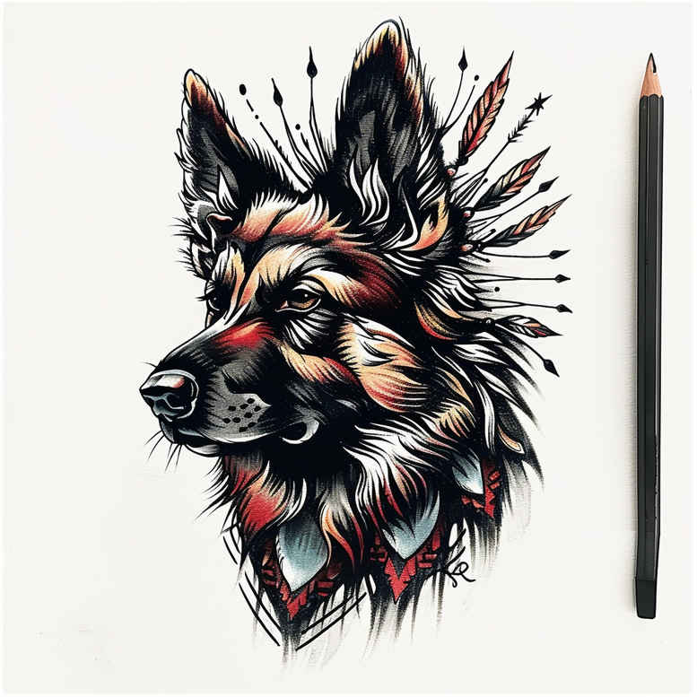 This AI-generated tattoo project presents a color-rich, dog head design rendered with bold lines and a graphic pattern backdrop. The focal point is a lifelike dog head in full color, with tight black contour work to render fur texture, warm reds for subtle shading around the muzzle and eyes, and crisp white highlights to create depth. Behind the head, a radiating pattern of spikes adds energy and contrast, turning a simple portrait into a dynamic composition that can translate well to various placements. A pencil included for scale signals that this is a design study and idea rather than a finished piece, inviting client input on size, line weight, and color saturation. The piece straddles a contemporary illustration vibe and traditional tattoo sensibilities, making it adaptable to a range of styles, from realistic to more graphic, depending on the ink you choose. Symbolically, the dog evokes loyalty and guardianship, while the geometric backdrop hints at momentum and resilience—qualifiers many clients seek in meaningful tattoos. From a technical standpoint, the design emphasizes clean silhouettes for cover-up potential, with bold outlines that maintain legibility over time and allow for graceful gradient shading in black and grey or vibrant color work. It is suitable as a small tattoo or as a larger centerpiece in a sleeve or back piece, and it aligns with the lexicon of tattoo design by combining animal portraiture, graphic pattern, and color to create a memorable body art motif. As an AI-generated tattoo project, this concept showcases how machine-assisted ideation can inform and inspire professional tattoo design, offering a flexible starting point for custom tattoo design, fine line variants, and other directions within the broader worlds of ink, black and grey, and color tattoos.