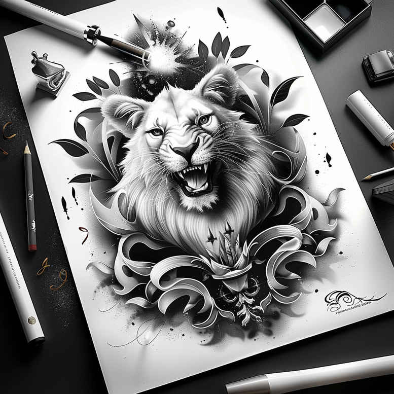 AI-generated tattoo project concept presented as a black and grey lion portrait framed by ornamental swirls, captured here on paper with visible pencils, markers, and an eraser to foreground the design process. The lion’s head is rendered with precise shading and a dense mane that blends into scrollwork and leaf motifs, forming a cohesive frame that reads well as a tattoo design. The contrast of deep blacks, mid-gray shading, and restrained highlights creates a lifelike texture in the fur while keeping the composition punchy for cover-up potential. The surrounding ornament reinforces a decorative balance, enabling the piece to suit larger placements yet remaining legible on smaller canvases. Given its dark value range, this concept emphasizes a cover-up option, using negative space and bold silhouettes to obscure prior ink while preserving dramatic impact. The technique centers on crisp outlines, controlled gradients, and feathered transitions to maintain depth with aging. Symbolically, the lion embodies courage and leadership, while the swirls convey motion and protection and the leaves imply growth; together they form a meaningful tattoo that pairs well with lotus flower or other symbolic motifs in a custom tattoo design. This description nods to Japanese and tribal influences through strong silhouette work, all rendered in black and grey ink for a timeless body art statement. As an AI-generated tattoo project concept, it offers a solid starting point for clients seeking a cover-up-ready, realistic lion portrait with decorative energy in ink. It supports meaningful tattoos, fine line work, and adaptability to small or large tattoos.