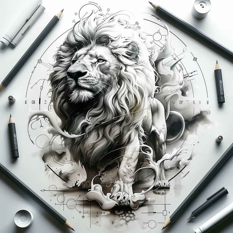 This lion portrait is rendered in black and grey with careful shading and crisp linework. The centerpiece is a regal lion seated with a full mane, its gaze steady, exuding courage, leadership, and protection. Surrounding the animal are drafting tools and a sketchbook page, establishing the design as a study and a tattoo concept rather than a finished piece; the image reads as a realistic study that could evolve into a full tattoo design. Technique emphasizes grayscale gradients, cross-hatching, stippling for texture, and controlled highlights to convey fur depth while preserving legibility on skin. The composition balances dense form with deliberate negative space, creating a bold focal point that translates well from small placements like the forearm or shoulder blade to larger panels on the back or chest. Symbolically, the lion anchors meanings of strength and guardianship, and the motif can be paired with lotus flower tattoos for balance, infinity motifs for permanence, or subtle tribal lines to broaden a sleeve concept. For a range of styles, the design adapts to fine line techniques or more traditional Japanese style influences, while maintaining the core black and grey realism that remains timeless in body art. If used as a cover-up, the dense shading provides robust masking potential, and adjustable line weight lets clinicians tailor opacity for skin tone and scarring. This AI-generated tattoo project concept demonstrates how pencil-inspired rendering can translate into ink-ready guidance, blending authenticity with digital creativity. In sum, the design promises meaningful tattoos, custom tattoo design, and the enduring appeal of black and grey realism in modern body art.