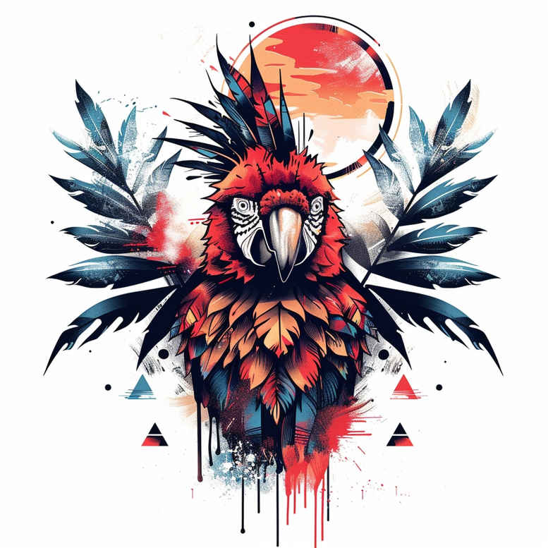 AI-generated tattoo project featuring a vivid parrot rendered in a lush watercolor palette with a sun backdrop, teal foliage, and crisp geometric triangles. The piece reads as a study in vibrant life and dynamic contrast, with the parrot’s plumage built from layered washes of red, cobalt, emerald, and gold that bleed into soft edges, while splashes and drips create a painterly atmosphere. The sun sits behind as a warm halo, anchoring the composition and suggesting a moment of stillness amid motion. Surrounding leaves provide a natural frame and reinforce themes of growth and renewal, while angular triangles introduce a contemporary, pattern-driven edge that nods to modern tattoo aesthetics. The design emphasizes balance between organic forms and geometric accents, making it suitable for a bold full-color tattoo or a refined black-and-grey reinterpretation. Technique-wise, the piece combines clean linework for key contours with painterly shading and color gradients to simulate depth on skin; the waterfall-like color bleed is controlled to maintain legibility on larger canvases, and the interplay of light and shadow adds depth to the parrot’s gaze and plumage. Symbolically, the parrot evokes communication and intelligence, the sun signals vitality, and the leaves symbolize growth; together they form a meaningful tattoo concept that can be expanded into sleeves or small, standalone placements. For readers seeking guidance, this concept showcases how a single motif can carry narrative across styles such as Japanese-inspired, tribal, realistic, or floral tattoo traditions, while still delivering the bright energy of a tropical avian subject. As with many AI-generated tattoo projects, a skilled tattoo artist would refine line weight, adjust color density, and tailor the composition to fit a specific body area, ensuring the final tattoo design remains legible and expressive as a piece of body art, suitable for ink on arms, shoulders, backs, or calves, and adaptable to various skin tones and aging considerations.