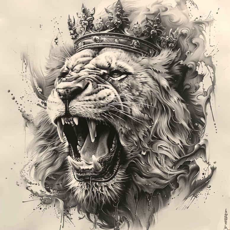 This AI-generated tattoo project presents a powerful lion head crowned in black and grey realism, rendered with dense shading, crisp linework, and painterly ink splatters that suggest motion and energy. The roaring maw, flowing mane, and royal crown fuse ferocity with sovereignty, inviting interpretations of courage, leadership, and guardianship. Executed in monochrome tones, the design employs smooth gradient transitions and high contrast to preserve legibility on larger canvases such as back, chest, or sleeve. While the piece reads as a bold tattoo design at first glance, it also functions as a versatile starting point for custom tattoo design collaborations, allowing adjustments in scale, detail, and placement. For clients seeking meaningful tattoos, the lion motif harmonizes with themes from Japanese style tattoo and tribal influences while remaining within the black and grey tradition; the crown adds a regal touch that pairs well with lotus flower tattoo or infinity tattoo motifs should a client wish to extend the narrative. The work emphasizes both realism and expressive brushwork, making it suitable for small tattoos with careful shading, but truly shines as a statement piece. From a technical standpoint, this black and grey piece relies on controlled shading, depth through negative space, and precise anatomy to keep the subject readable over time in body art ink. This project explicitly notes its AI origin, a starting point for commissions, stylistic tweaks, and placement testing. Because the image is very dark and intense, it is an ideal candidate for cover-up projects, offering an opportunity to mask older work beneath a new focal point that remains strong and legible as ink ages.