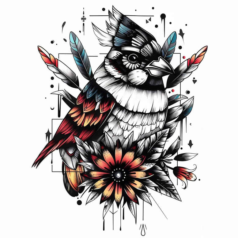 This color tattoo design presents an owl and sunflower motif rendered with fine line precision and bold black outlines. The central owl sits above a vivid sunflower, its petals warm pinks and oranges while blue-green leaves weave through the composition, balanced by crisp linework and color accents that create depth and motion. The piece uses negative space to keep the image legible on skin, while geometric accents add a contemporary graphic edge. Key elements are the owl, sunflower, and leaves, with supportive motifs echoing ink splashes and linear pattern. Symbolically, the owl embodies wisdom and watchfulness while the sunflower stands for vitality and renewal, making this a meaningful tattoo choice for nature lovers or those seeking a statement piece. Technically, it blends fine line tattoo technique with saturated color blocks, delivering a color-drenched effect that remains durable and legible over time. Although the scene centers on natural imagery, its graphic patterns align with modern tattoo aesthetics and adapt well to placements from forearm to back. In the broader tattoo vocabulary, this design sits among meaningful tattoos and can be reimagined as lotus flower tattoo, infinity tattoo, tribal tattoo, or rose tattoo design for a customized portfolio. As an AI-generated tattoo project, it demonstrates how digital concepts translate into tattoo-ready artwork, guiding decisions on line weight, color harmony, and flow across the body. The result is a versatile piece of body art that resonates with lovers of Japanese style tattoo influences, realism, and fine-line precision while staying anchored in botanical iconography and ink finesse, with attention to symbolism, composition, and longevity.