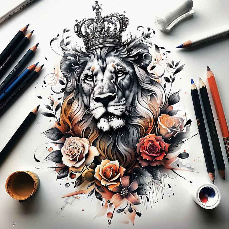 AI-generated tattoo project presents a commanding composition: a lion’s head wearing a regal crown, encircled by a lush bouquet of roses and curling leaves. Rendered in a hybrid approach that blends fine line precision with watercolor-like color, the design balances bold linework with soft shading to achieve depth and luminosity on skin. The lion’s gaze conveys power and guardianship, while the crown reinforces majesty. The roses introduce warmth and life, their velvety petals in coral and peach hues contrasted against dark ink to create a striking focal point. The surrounding flora acts as a decorative frame, turning the piece into a cohesive botanical pattern that can wrap around an arm or shoulder. Pencil-like sketch marks on the periphery suggest the concept stage, emphasizing that this is a design study ready for refinement. Technique-wise, expect crisp black lines for structure, subtle grey washes for volume, and selective color layering to preserve skin-friendly contrast. The imagery lends itself to a diverse range of tattoo applications—from small to medium-sized pieces, with a Japanese-style influence in composition and balance. Symbolically, the lion represents courage and leadership, the crown denotes authority, and the bouquet symbolizes beauty, growth, and renewal. For those seeking meaningful tattoos, this design ticks boxes for a powerful, timeless piece, and its floral elements provide a natural cover for lighter scars, making it a viable choice for a cover-up project. In short, this tattoo design synthesizes realism with decorative motifs, offering a bold statement in full color with bursts of hue, a versatile choice for custom tattoo design, and a compelling example of modern body art. It is well-suited for a range of traditions—from fine line tattoo to realistic tattoo and Japanese style tattoo—and can be adapted to lotus flower tattoo, infinity tattoo, or tribal tattoo concepts depending on placement and symbolism. AI-generated tattoo projects may adapt this concept further to personal symbolism, placement, and scale.
